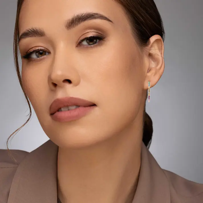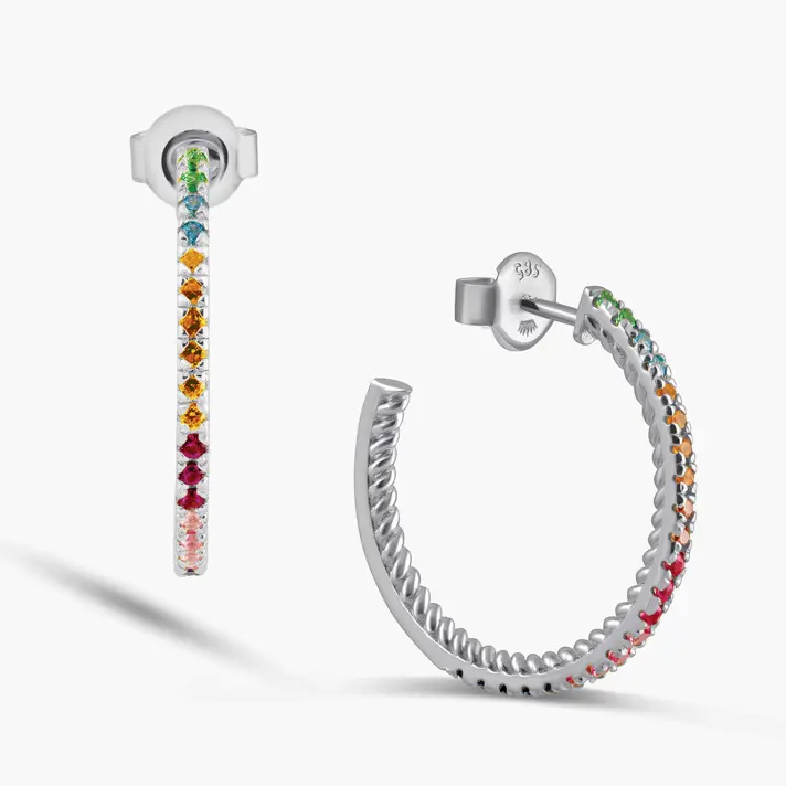 עגילי זהב 14K מקולקציית ה RAINBOW, בצורת חישוקים בשיבוץ אבני חן מסוג קוורץ ורוד בהיר וכהה, בלו ספיר , גרנט ירוק, טופז כחול וסיטרין צהובה. קוטר העגילים 2.2 ס"מ.