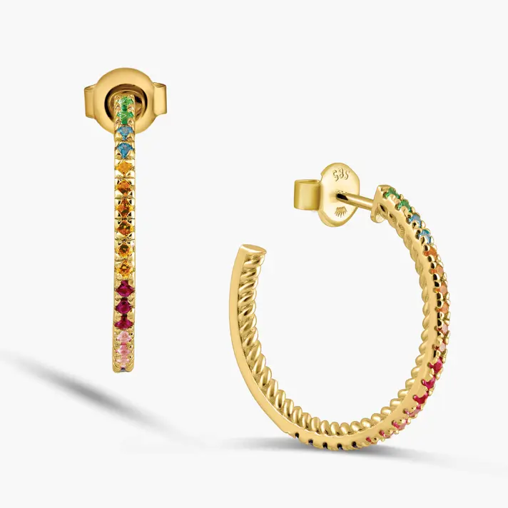 עגילי זהב 14K מקולקציית ה RAINBOW, בצורת חישוקים בשיבוץ אבני חן מסוג קוורץ ורוד בהיר וכהה, בלו ספיר , גרנט ירוק, טופז כחול וסיטרין צהובה. קוטר העגילים 2.2 ס"מ.
