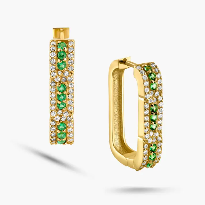 עגילי 14K רבועים בשיבוץ 98 יהלומים טבעיים ונוצצים ו 18 גרין גרנט. אורך העגילים 2.4 ס"מ.