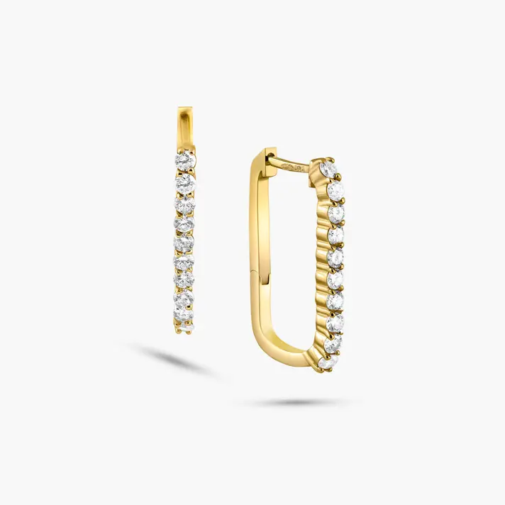 עגילי זהב 14K מלבניים בשיבוץ 20 יהלומים טבעיים ונוצצים. מידות העגילים 2.0*1.1 ס"מ.