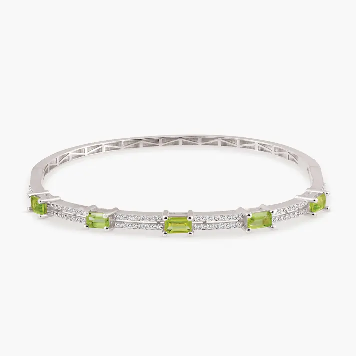 צמיד זהב 14K קשיח בשיבוץ 84 יהלומים טבעיים ונוצצים ו5 פרידוט ירוקות בחיתוך באגט היוקרתי.