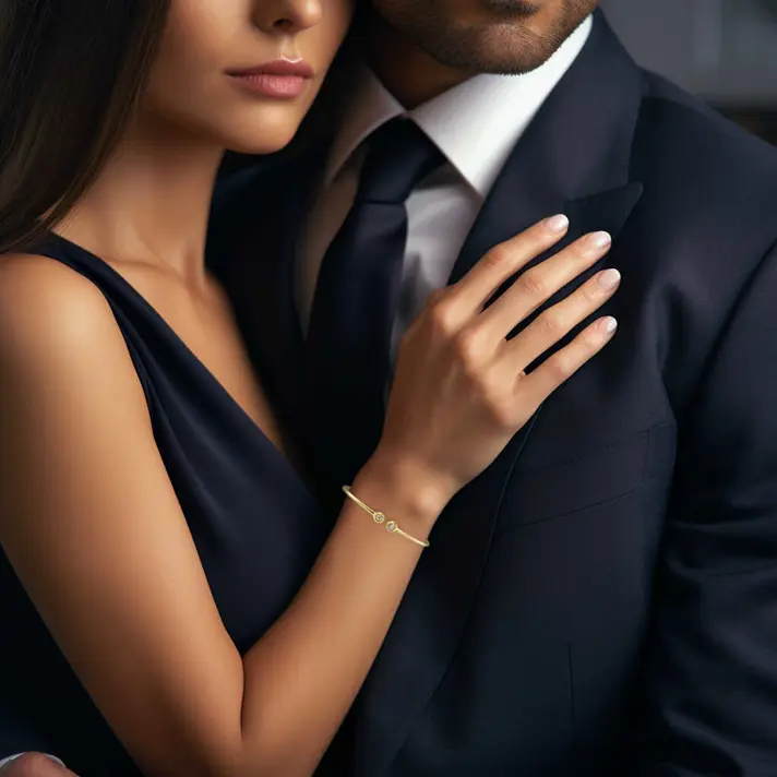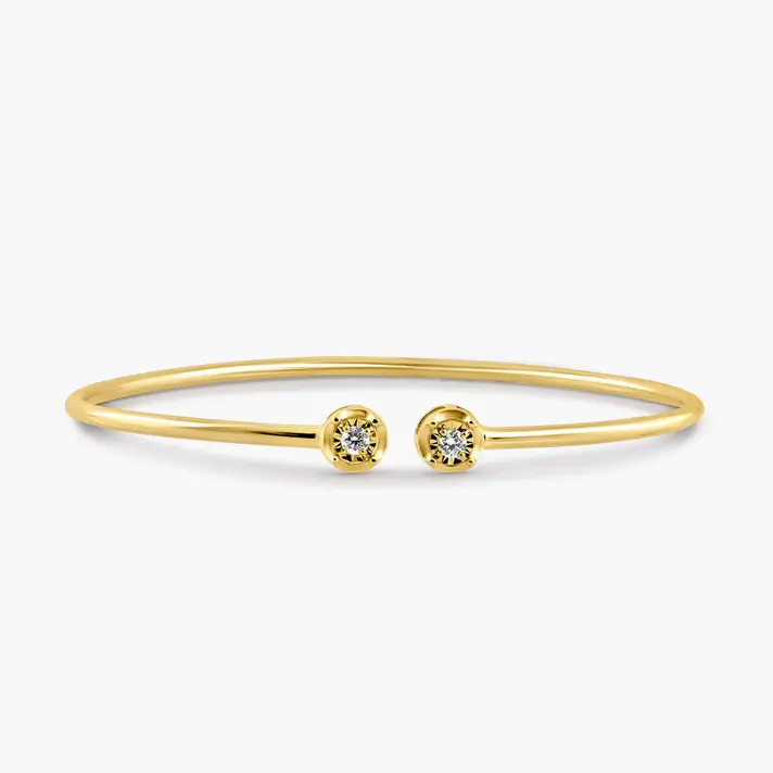 צמיד זהב 14K קשיח עם סיומת פתוחה בשיבוץ 2 יהלומים טבעיים ונוצצים.