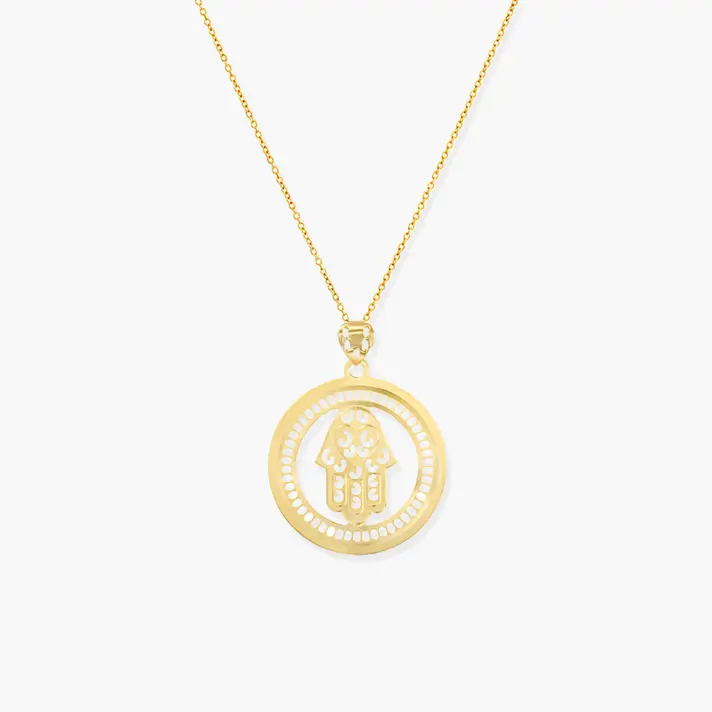 תליון זהב 14K המעוצב כחמסה מססגרת עגולה של זהב בקוטר 2.5 ס"מ.