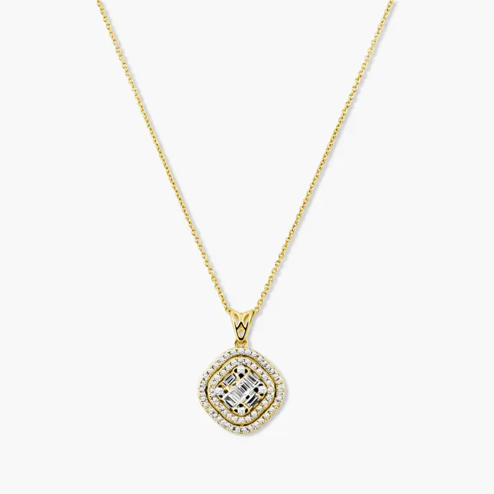 תליון זהב 14K מעויין מרהיב בשיבוץ 66 יהלומים טבעיים ונוצצים מתוכם 6 בחיתוך באגט היוקרתי.
