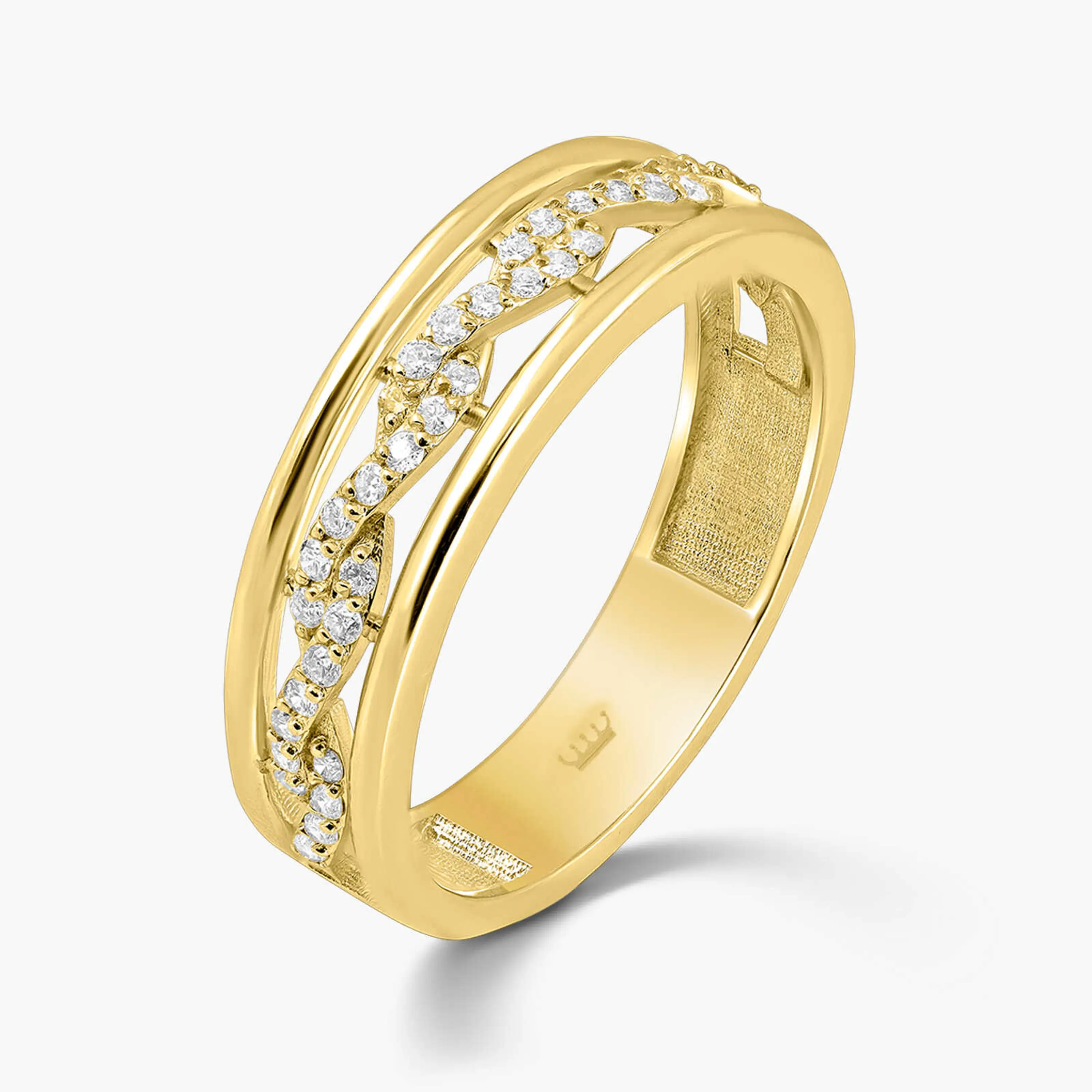 טבעת זהב 14K בעובי 5.5 מ"מ, עם מסגרת חלקה ובאמצעה גל משובץ 43 יהלומים טבעיים ונוצצים.