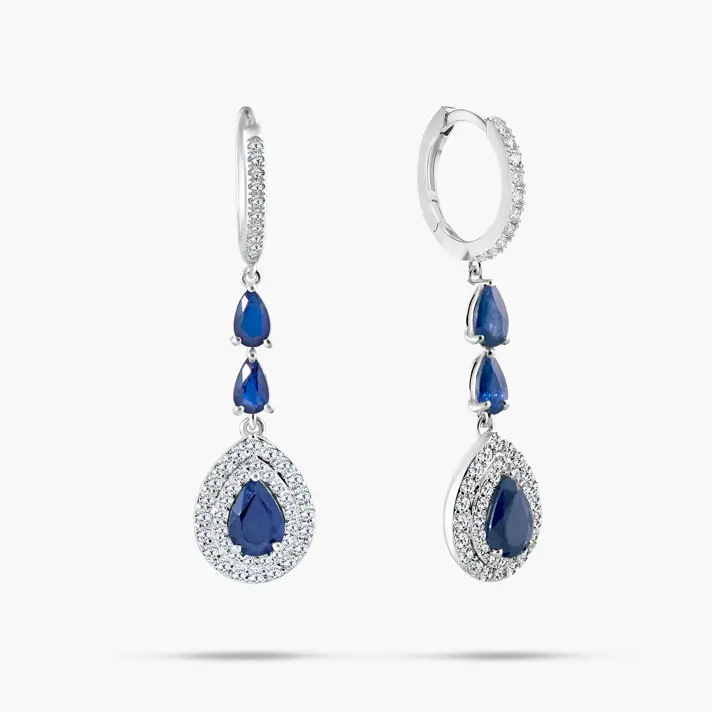 עגילי זהב 14K בשיבוץ יהלומים ו6 טיפות ספירים כחולים ו 96 יהלומים טבעיים ונוצצים.