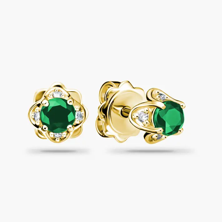 עגילי זהב 14K צמודי אוזן משובצים באבני אמרלד ירוקות המוקפות ב 8 יהלומים טבעיים ונוצצים. קוטר העגילים 4 מ"מ.