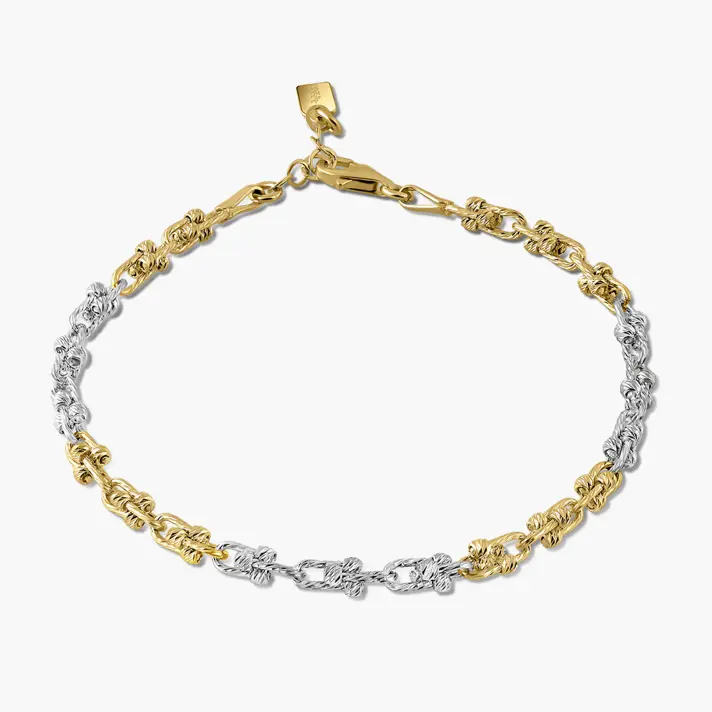 צמיד מירן מזהב 14K ביקולור צהוב ולבן עשוי חוליות מלבניות בסיומת כדור זהב. הצמיד הינו חלק מקולקציית ה- GOLDEN GLOW החדשה השומרת על קווים קלאסיים ובעיצוב עכשווי. אורך הצמיד 17.5 ס"מ+ 2 ס"מ הארכה נוספים.