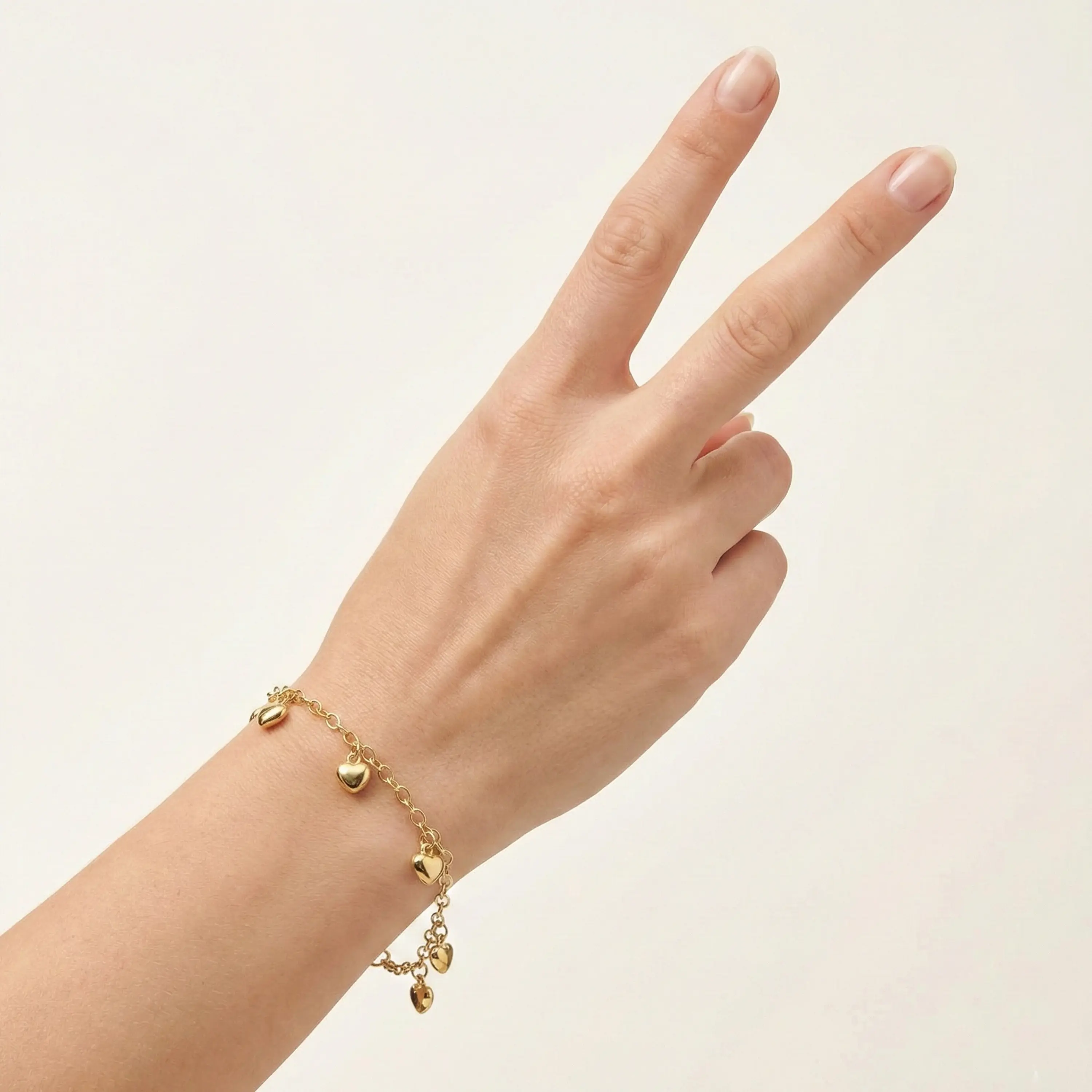 צמיד זהב 14K משולב 6 צ'ארמים של לבבות ובשיבוץ שני זרקונים. אורך הצמיד 17.5 ס"מ + 2.5 ס"מ הארכה נוספים.