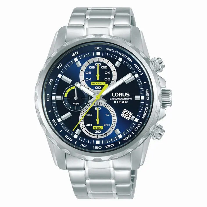 שעון LORUS גברים מבית SEIKO יפן. השעון מצטרף לקולקציית הספורט-כרונוגרף עם מנגנון קוורץ, לוח בגוון כחול עמוק, לוחות משנה בגוון כסוף ומחוגים בירוק זרחני. לשעון 3 שעוני משנה הכוללים כרונוגרף עד 30 דקות במרווחים של שנייה אחת. פונקציות נוספות : מחוון עתודות כח,זכוכית קריסטל מינרלית, עמידות במים עד 100 מ' ותאריכון.קוטר השעון 43 מ"מ והוא מגיע עם צמיד מפלדת אל חלד איכותית בגוון כסוף.