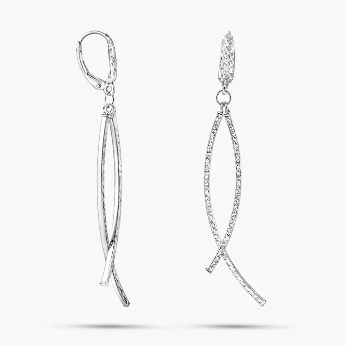 עגילי זהב 14K הבנויים משני קשתות המצטלבות אחת בשנייה בגימור לייזר מנצנץ . אורך העגילים 7.2 ס"מ.