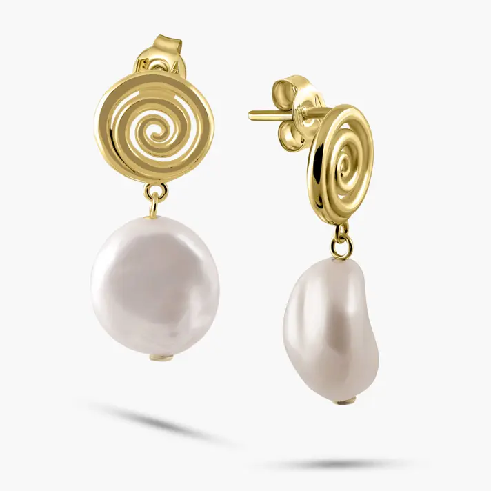 עגילי ספירלה מזהב בשילוב פנינת ckeshi
