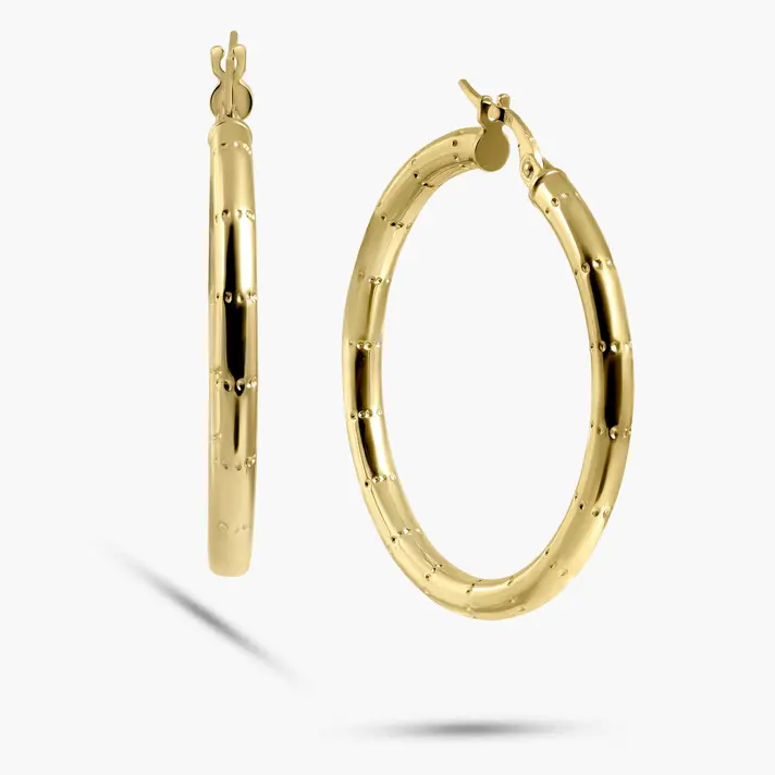 עגילי חישוקי זהב 14K בעיצוב טקסטורלי ייחודי בהשראת תנועה טבעית של אור עם נגיעות של נקודות עדינות שמעניקות להם אופי שובה לב ומראה בלתי שגרתי. שילוב מדויק של עידון וסטייל, שמתאים לכל שעה ולכל הופעה. העגילים מצטרפים לקולקציית DAY AND NIGHT המתאימה 24-7. קוטר העגילים 3.5 ס"מ.