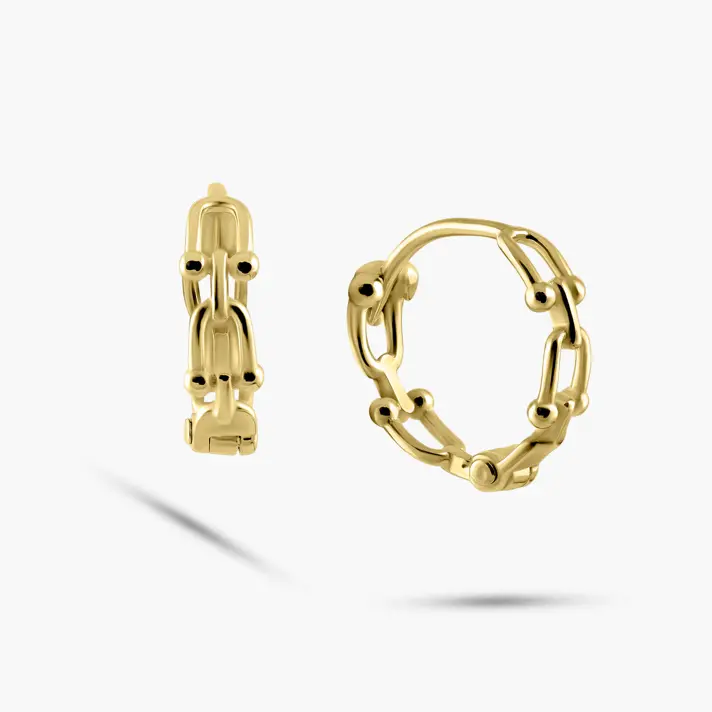 עגילי חישוק בעיצוב ייחודי עשויים זהב צהוב 14K, המשלבים חוליות מוארכות עם נגיעות עגולות ליצירת מראה תעשייתי-אלגנטי. העיצוב הגיאומטרי המובחן מעניק לעגילים אופי בולט, תוך שמירה על איזון בין קשיחות לרכות עיצובית. בחירה מושלמת למי שמחפשת סטייל ייחודי עם טוויסט מודרני.