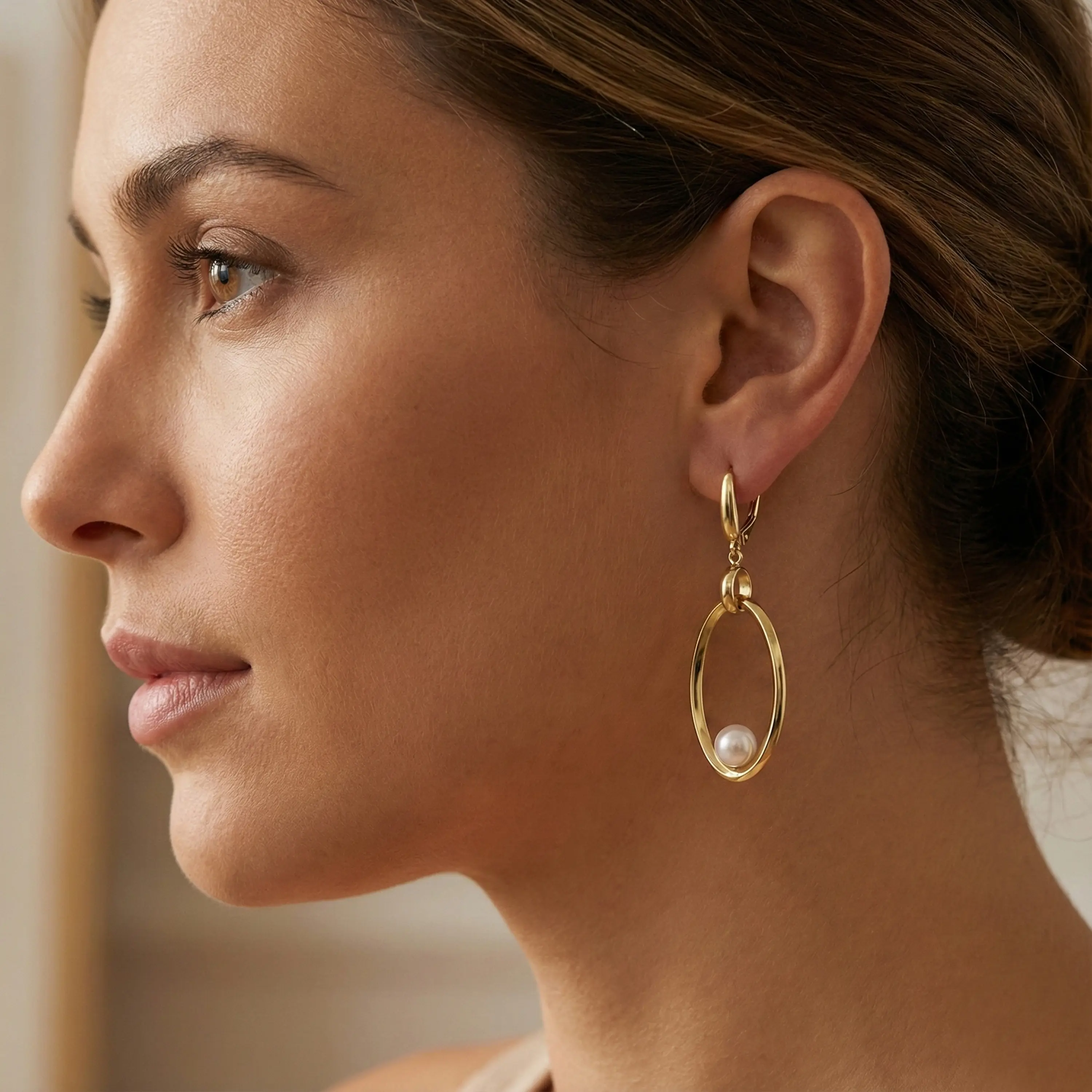 עגילי תלייה אלגנטיים עשויים זהב צהוב 14K, בעיצוב טיפה פתוחה וזורמת. בתוך כל עגיל משובצת פנינה לבנה בחלקו התחתון, המוסיפה טאץ’ קלאסי ועדין לקו הנקי של העיצוב. שילוב מושלם בין אלגנטיות טבעית לנוכחות מעודנת. מידות העגילים 5.2*1.9 ס"מ. קוטר הפנינים 8 מ"מ.
