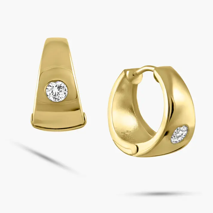 עגילים בעיצוב חישוק אלגנטי ונקי, עשויים זהב צהוב 14K בגימור מבריק. במרכז כל עגיל משובץ זרקון נוצץ בחיתוך עגול, השוכן בתוך מסגרת חלקה ומודרנית לקבלת מראה מינימליסטי עם טאץ' יוקרתי. מתאימים לכל שעה ביום – מבוקר בעבודה ועד ערב חגיגי. מידות 1.4*0.8 ס"מ.