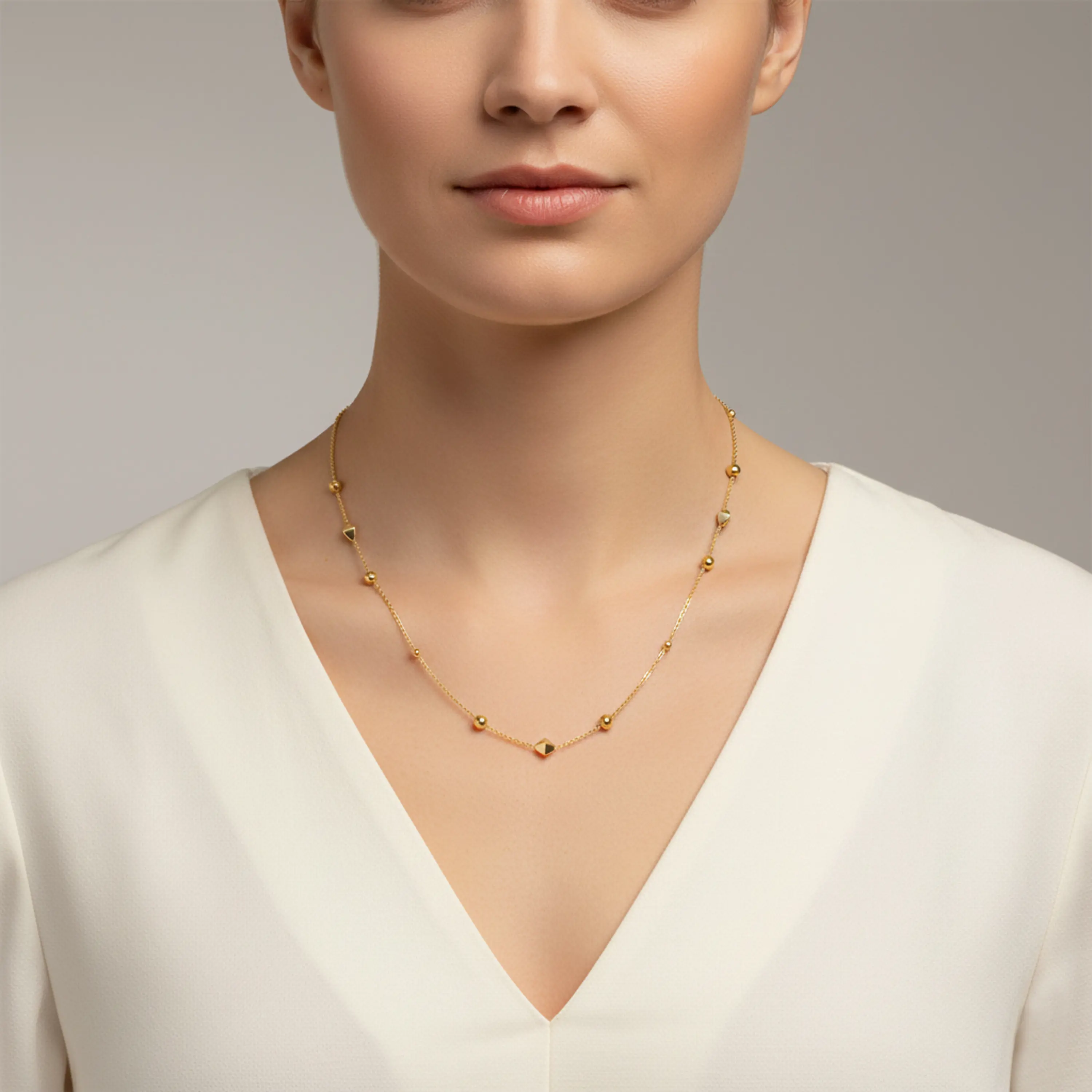 שרשרת עדינה ואלגנטית עשויה זהב צהוב 14K מלא , משולבת חרוזים עגולים מלוטשים וחרוזים גיאומטריים בעלי חיתוך פאות עדין היוצרים נצנוץ רך עם תנועת השרשרת. עיצוב סופר נוח ויומיומי שמתאים גם לשכבות וגם לענידה בפני עצמה. אורך השרשרת 45 ס"מ.