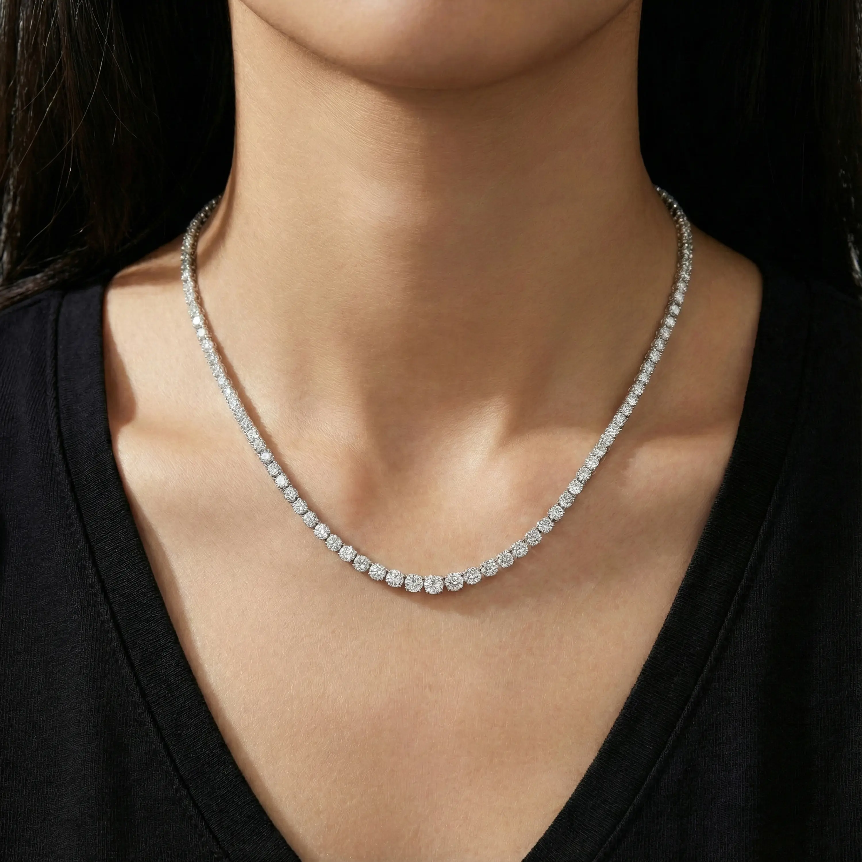 שרשרת טניס יוקרתית בזהב לבן 14K, בעיצוב מדורג ומרהיב הכולל 103 יהלומים טבעיים ונוצצים בקוטר הולך וגדל בהדרגה אל מרכז השרשרת ליצירת מוקד ברק מרשים שמושך את העין.