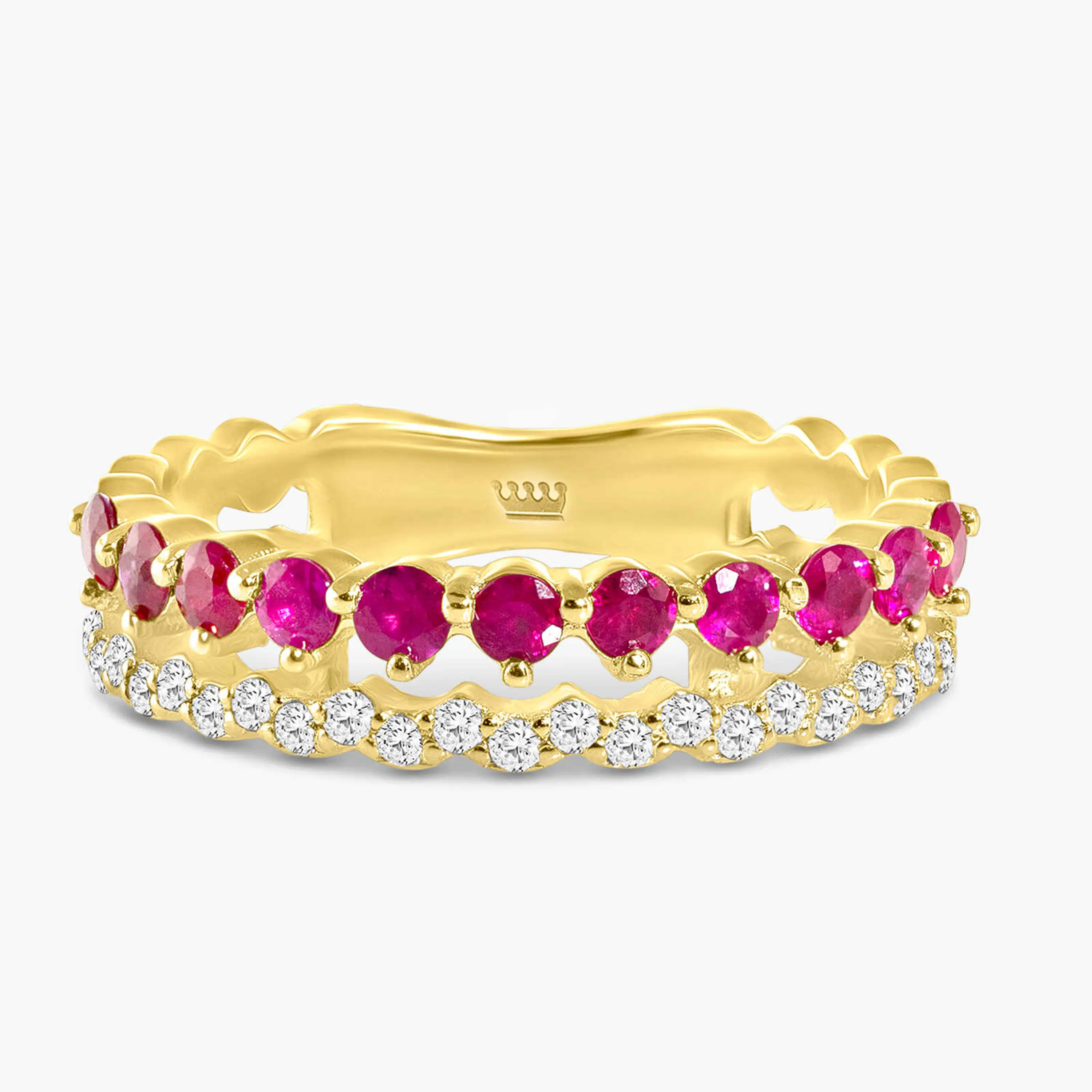 טבעת זהב 14K בעיצוב כפול בצורת גל, המשובצת 23 יהלומים טבעיים ונוצצים ו-11 אבני רובי אדומות. התנועה הגלית בין שתי השורות יוצרת תחושת רכות, בעוד השיבוץ הצפוף מעניק נוכחות עשירה וזוהרת. תכשיט שמסמל תשוקה ויוקרה, עם נגיעה מלכותית בלתי מתפשרת.