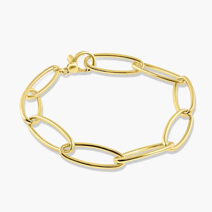 צמיד חוליות טרנדי מזהב 14K בעיצוב מינימליסטי ונקי עם חוליות אובליות גדולות בגימור מבריק ליצירת נוכחות עדינה אך מרשימה. העיצוב הקליל והעדכני משתלב נהדר עם כל לוק  לבד או בשכבות עם צמידים נוספים. תכשיט מודרני שמתאים בדיוק לאוהבות סטייל פשוט, מדויק ויוקרתי. אורך הצמיד 19 ס"מ, מידות החוליות 0.8*2.2 ס"מ.