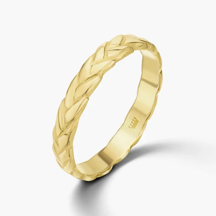 טבעת נישואין בזהב 14K בעלת עיטור צמה לכל אורך הטבעת. ניתן להזמין בכל צבע זהב ומידה.