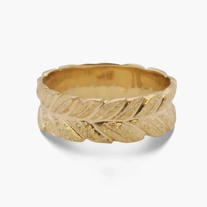 טבעת נישואין בזהב 14K בעלת עיטור עלה לכל אורך הטבעת. ניתן להזמין בכל צבע זהב ומידה.