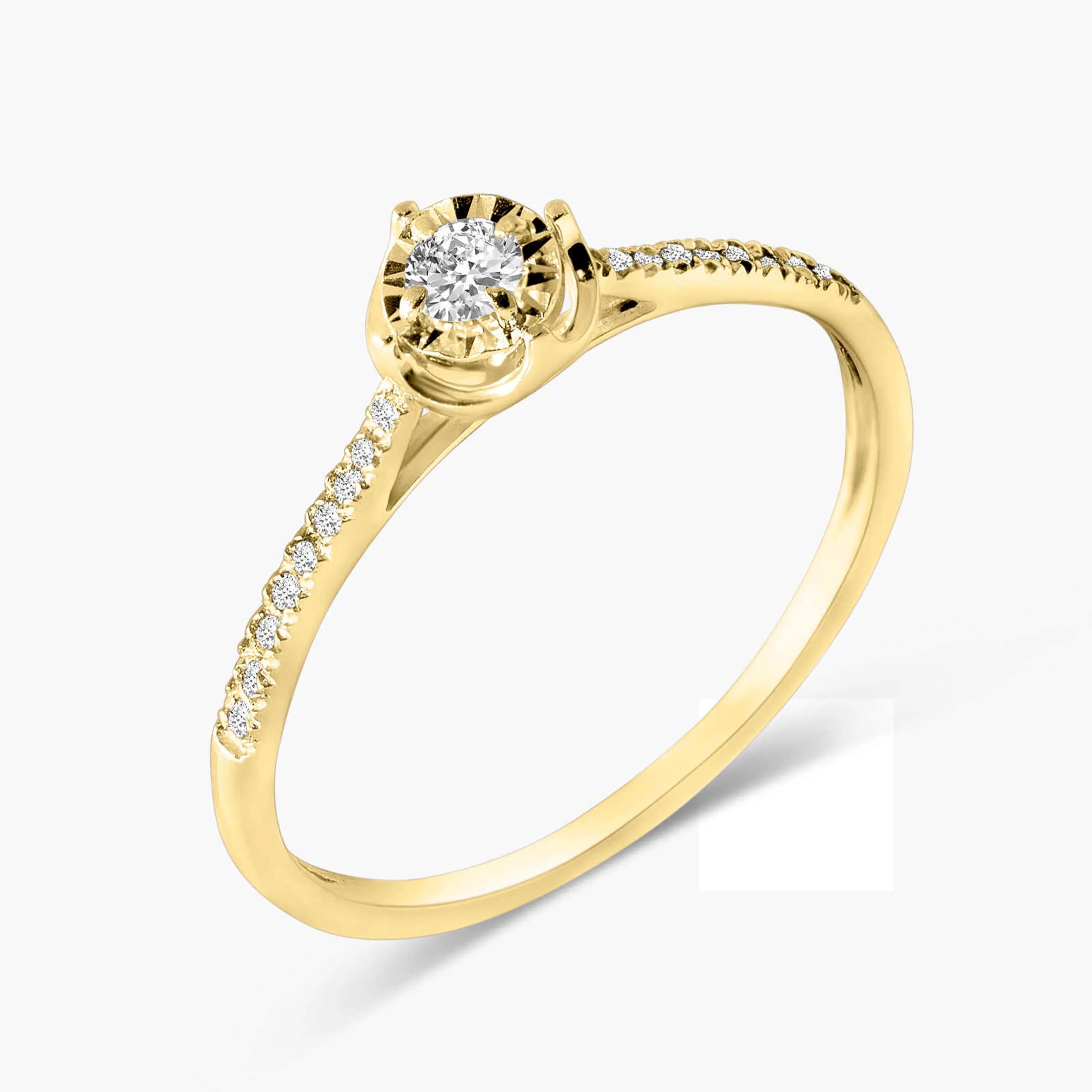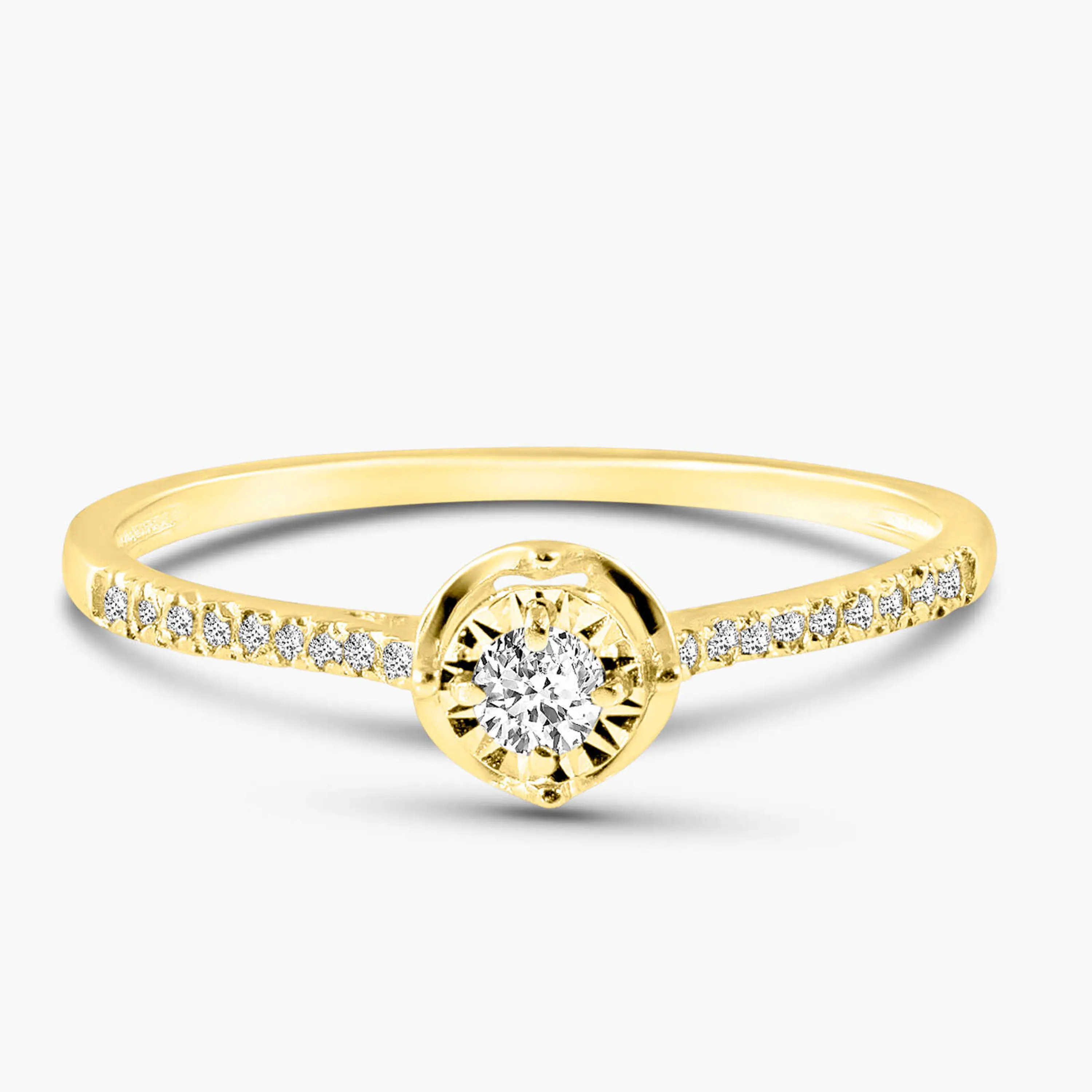 טבעת זהב 14K בעיצוב סוליטר קלאסי עם יהלום מרכזי נוצץ, משובצת 18 יהלומים קטנים לאורך החישוק ליצירת ברק מרהיב. שילוב של אלגנטיות נצחית עם מגע מודרני, מושלמת להצעת נישואין.
