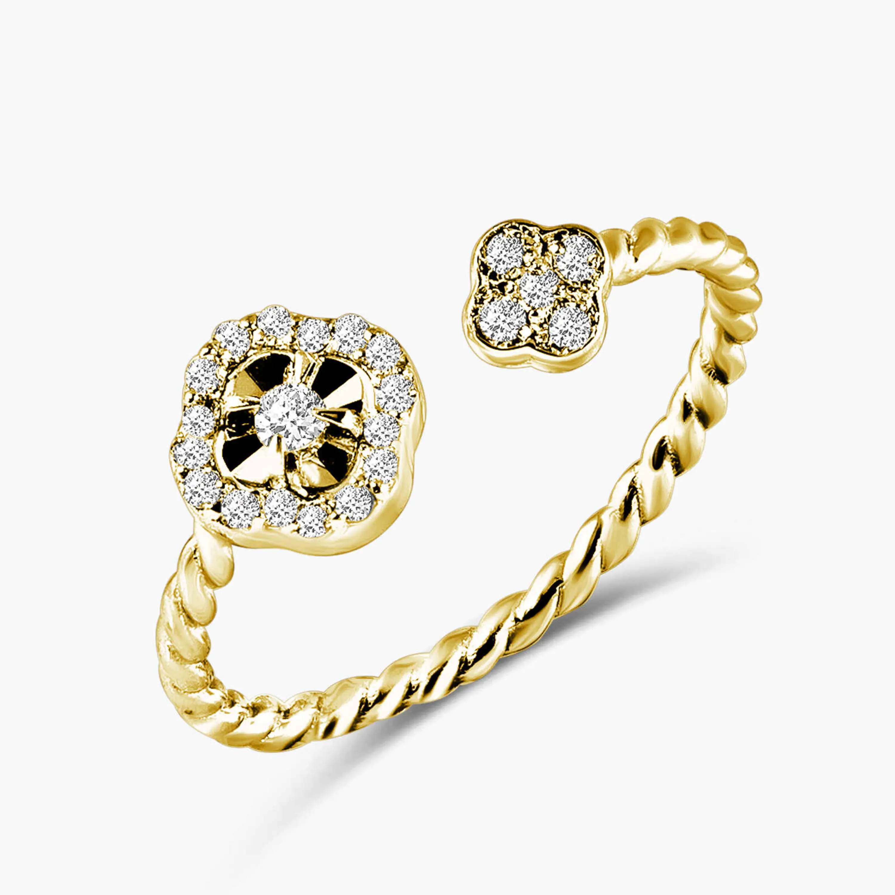 טבעת אלגנטית ומיוחדת, עשויה זהב צהוב 14K בעיצוב פתוח עם שתי יחידות פרחוניות משובצות 22 יהלומים טבעיים ונוצצים. גוף הטבעת מעוצב בטקסטורת חבל המעניקה לטבעת מראה יוקרתי אך גם קליל.
