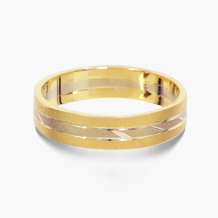 טבעת נישואין עם עיטורי פסים עדינים בשילוב של זהב צהוב וזהב לבן. ניתן להזמין בכל צבע, מידה ורוחב.