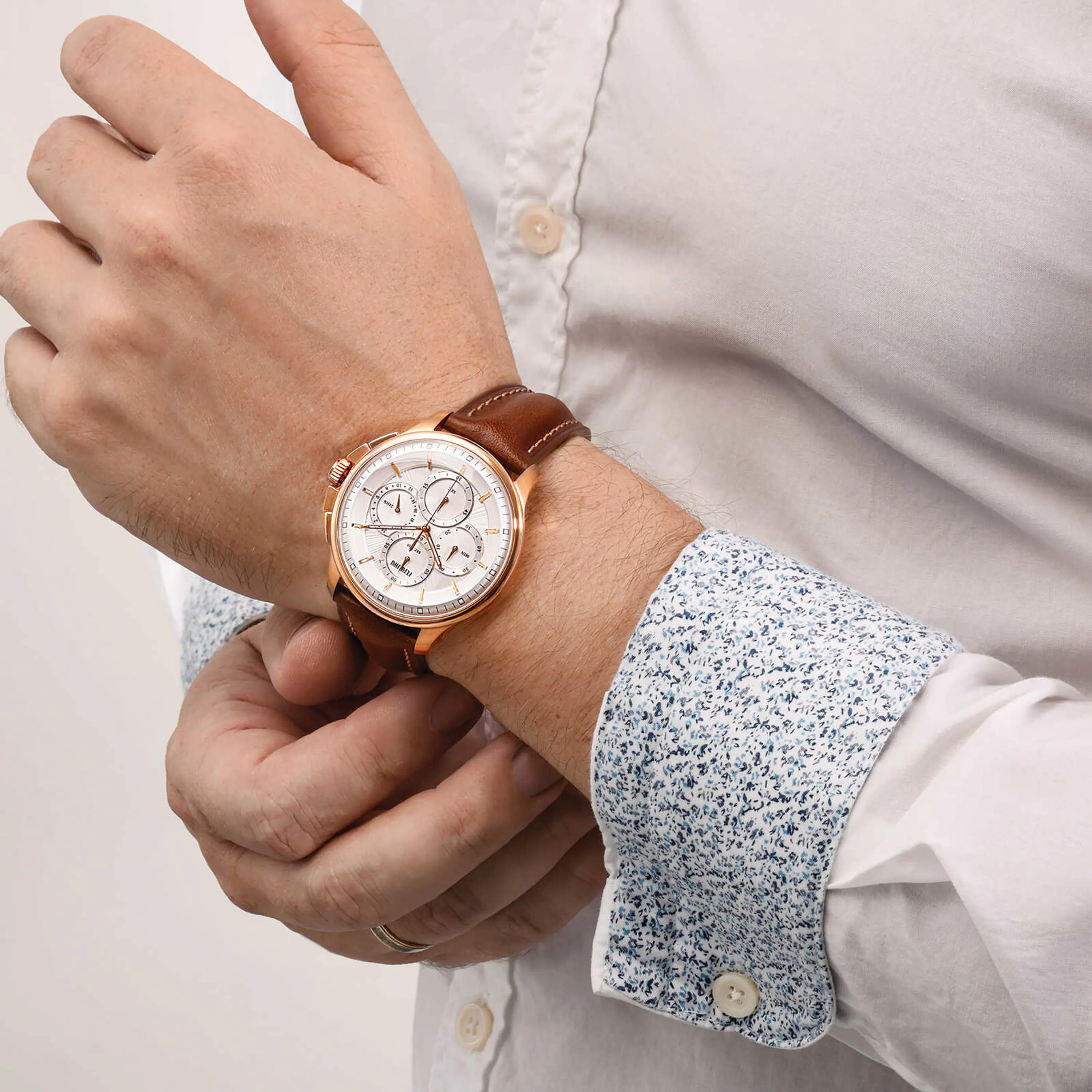 שעון כרונוגרף FERRARI לגבר. לשעון מנגנון VD56 קוורץ כרונוגרף, הכולל מדידת זמן עד 1/10 שנייה, עצירת שניות, שעון 24 שעות, וספירת דקות עד 60. לשעון לוח בגוון לבן כסוף וזכוכית מינרלית קשיחה בצורת כיפה כפולה. גוף השעון עשוי פלדה בגווני רוז גולד והרצועה עשויה מעור איכותי בגוון חום תואם עם תיפורים בגוון רוז גולד. קוטר השעון 42 מ"מ והוא עמיד במים עד 50 מ'.
