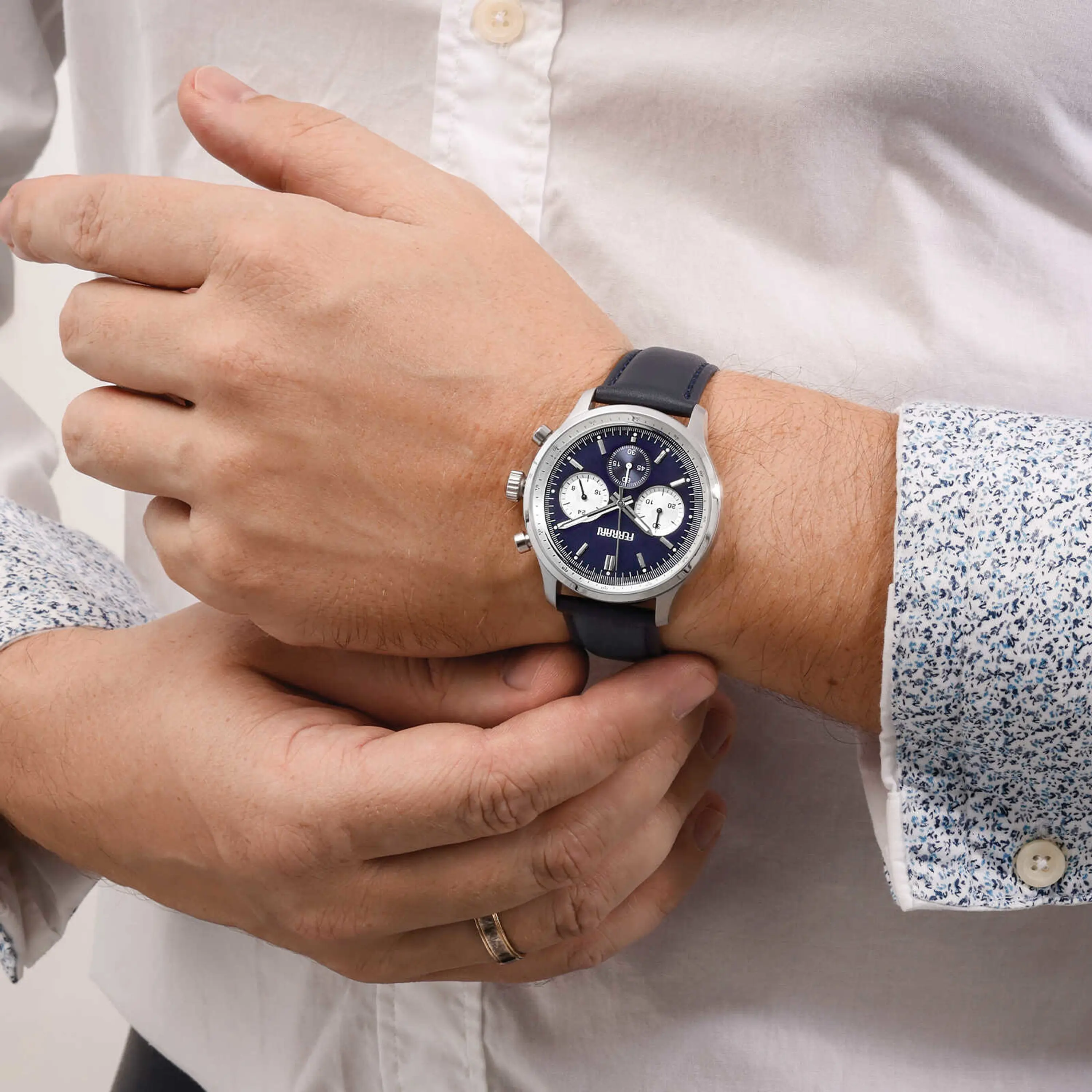 שעון כרונוגרף FERRARI לגבר. לשעון מנגנון VR31 קוורץ כרונוגרף ושעון 24 שעות, לוח בגוון כחול כהה וזכוכית מינרלית מלוטשת. גוף השעון עשוי פלדה והרצועה עשויה מעור איכותי בגוון כחול תואם. קוטר השעון 41 מ"מ והוא עמיד במים עד 100 מ'.