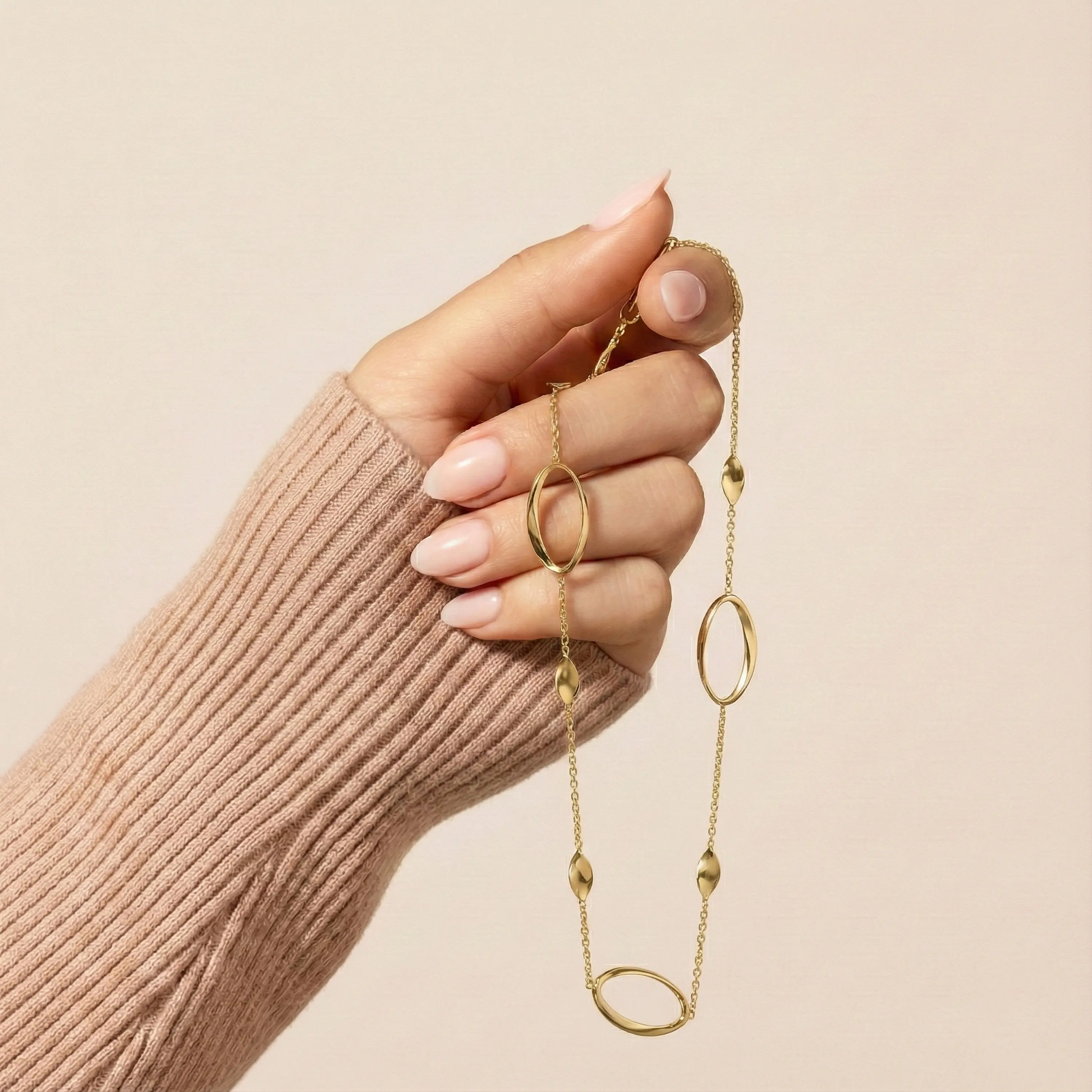 שרשרת זהב 14K בעיצוב מודרני ואלגנטי, הכוללת חוליות דקות ומשולבות באלמנטים אובליים ואלמנטים בצורת טיפות בגימור מבריק. שילוב הצורות יוצר מראה דינמי ומוארך שמחמיא לכל מפתח צוואר, ומתאים לשילוב גם עם שרשראות נוספות ליצירת שכבות אופנתיות.אורך השרשרת 42 ס"מ+ 2 ס"מ הארכה נוספים.