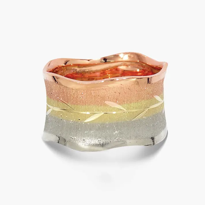 טבעת נישואין רחבה מזהב צהוב ולבן, בעיטורי עלים. ניתן להזמין בכל צבע, מידה ורוחב.