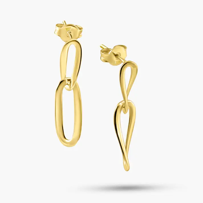 עגילי זהב יוקרתיים העשויים 14K, בעיצוב מודרני עם שילוב שתי חוליות האחת מוארכת ובעלת נוכחות, והשנייה מעוצבת בתנועה זורמת עם טוויסט עדין.