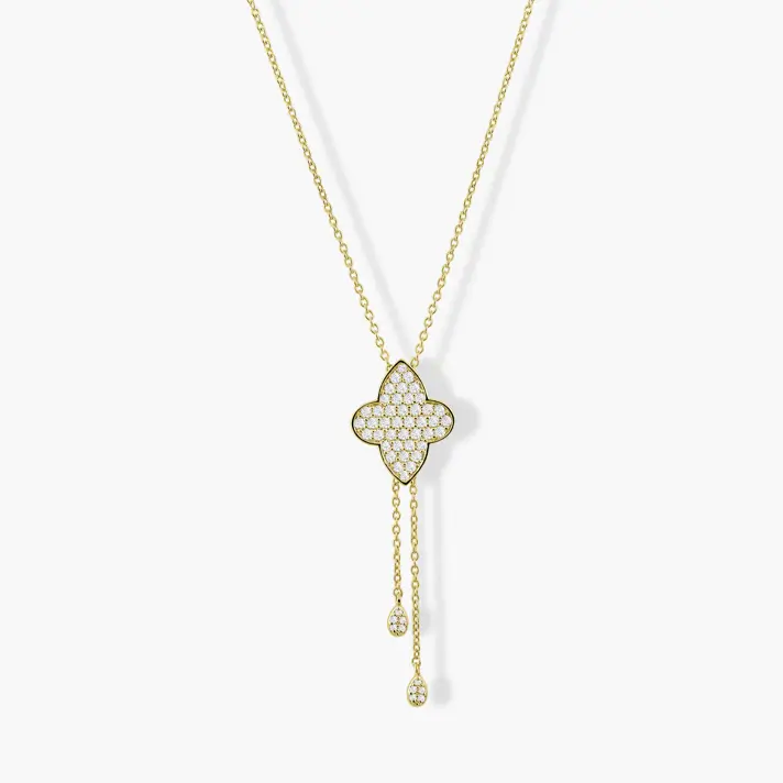שרשרת זהב 14K במראה עניבה ובשיבוץ 52 יהלומים טבעיים ונוצצים בעיצוב תליון תלתן, המשובץ כולו ביהלומים קטנים צפופים המעניקים לו ברק מרהיב מכל זווית. משני קצותיו משתלשלות שתי שרשראות דקות, שבקצה כל אחת תליון טיפה עדין משובץ יהלומים. שרשרת שמשלבת קלאסיות עם טוויסט מודרני, ומוסיפה מגע של זוהר ותנועה לכל מראה.