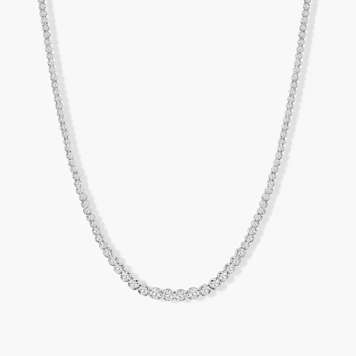 שרשרת טניס יוקרתית בזהב לבן 14K, בעיצוב מדורג ומרהיב הכולל 97 יהלומים טבעיים ונוצצים בקוטר הולך וגדל בהדרגה אל מרכז השרשרת ליצירת מוקד ברק מרשים שמושך את העין. כל יהלום משובץ בליטוש עגול ובשיבוץ שיניים מדויק, היוצר רצף אחיד ואלגנטי של זוהר עוצר נשימה. תכשיט אייקוני שמתאים לכלה ביום חתונתה ולאירועים מיוחדים.