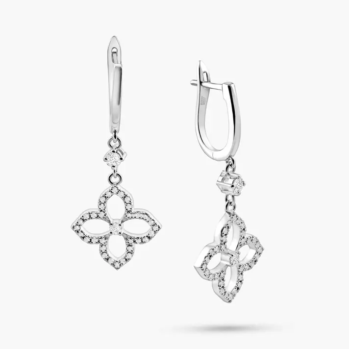 עגילי זהב לבן 14K משובצים 68 יהלומים טבעיים ונוצצים עיצוב מרחף ועדין בצורת פרח פתוח בעל ארבעה עלי כותרת סימטריים. כל עלה מעוטר בשיבוץ יהלומים עגולים, שמדגישים את הקווים הנקיים והאלגנטיים של העיצוב. היהלום המחבר בין התליון לחישוק מוסיף תנועה רכה וברק נוסף. תכשיט קליל, רומנטי ונשי מלא נוכחות בכל תזוזה.