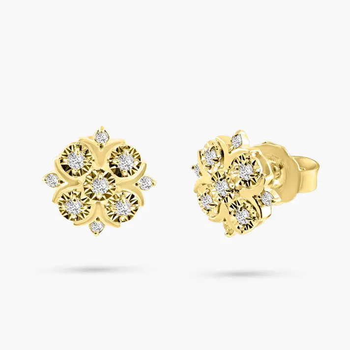 עגילי זהב 14K בעיצוב פרח גיאומטרי, משובצים יהלומים טבעיים ונוצצים שילוב מושלם בין סימטריה, ברק ואלגנטיות. כל עגיל מעוטר במבנה פרחוני בעל ארבעה עלי כותרת, כשבמרכז כל עלה עיבוד לייזר מנצנץ ועדין, ובתוכו משובץ יהלום טבעי זוהר. יהלומים נוספים משובצים בין העלים, ליצירת מראה עשיר, הרמוני ומלא אור. סך הכל משובצים בעגילים 18 יהלומים.