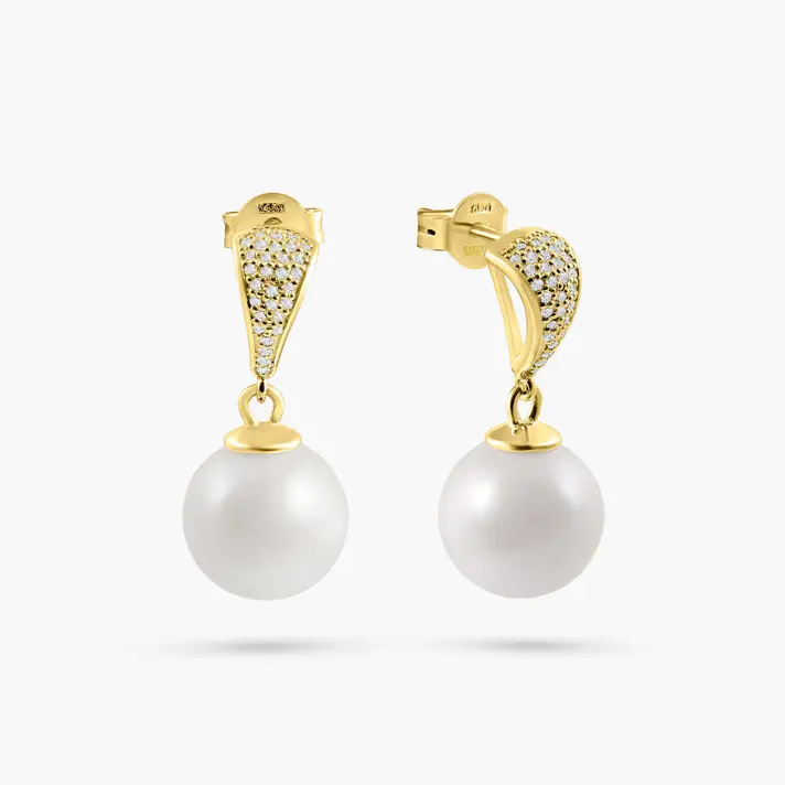 עגילי זהב 14K בשילוב 60 יהלומים טבעיים ונוצצים ופנינה בעיצוב אלגנטי ומעודן, המחבר בין ברק זהוב, נצנוץ יהלומים ורכות קלאסית של פנינה טבעית. החלק העליון של העגיל משובץ ביהלומים קטנים בצפיפות גבוהה ליצירת אפקט של שטח נוצץ, ממנו משתלשלת פנינה עגולה ולבנה בגימור חלק ומושלם.