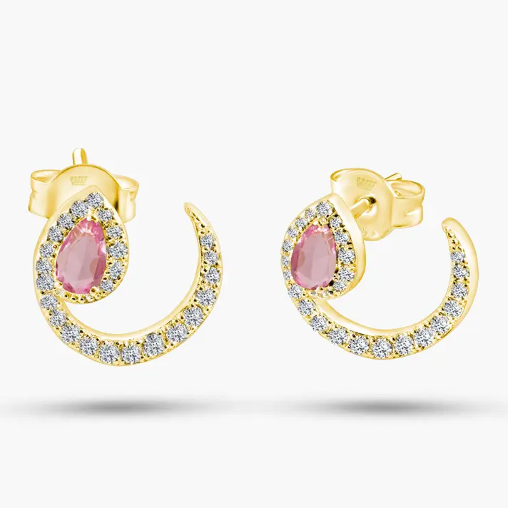 עגילי זהב 14K בעיצוב ייחודי, משובצים 50 יהלומים נוצצים וטבעיים ואבן חן מסוג ספיר בגוון ורוד. השיבוץ המדויק והצורה האלגנטית יוצרים מראה יוקרתי ומרשים, המתאים להשלמת כל הופעה באלגנטיות נצחית.