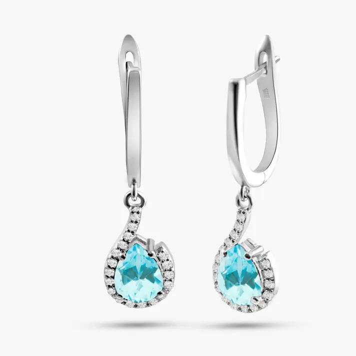עגילי זהב 14K מסדרת Lumiere – בהשראת ההמפגש בין זוהר היהלומים לעומק הצבע של אבן החן, בעיצוב טיפה פתוחה שמדמה תנועה רכה ואור עדין. העגילים משובצים 36 יהלומים טבעיים המקיפים אבן חן מרכזית מסוג בלו טופז הנתלה בעדינות מחישוק זהב לבן מבריק. עגיל קליל, נשי ומדויק – מלא אור בכל תנועה.