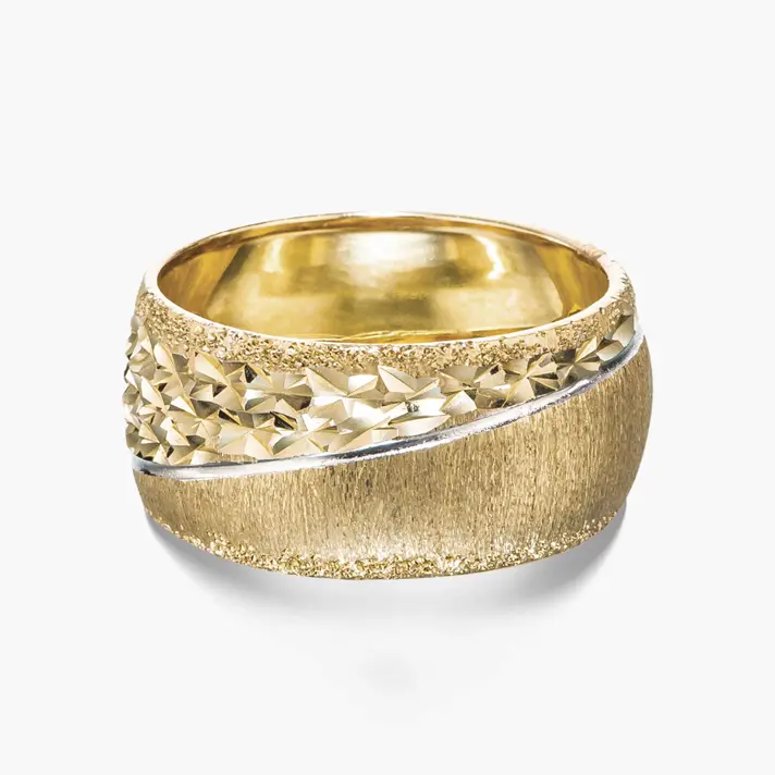 טבעת נישואין בזהב צהוב, המשלבת כמה סגנונות ורקעים . ניתן להשיג את הטבעת בכל צבע זהב,גודל ורוחב.