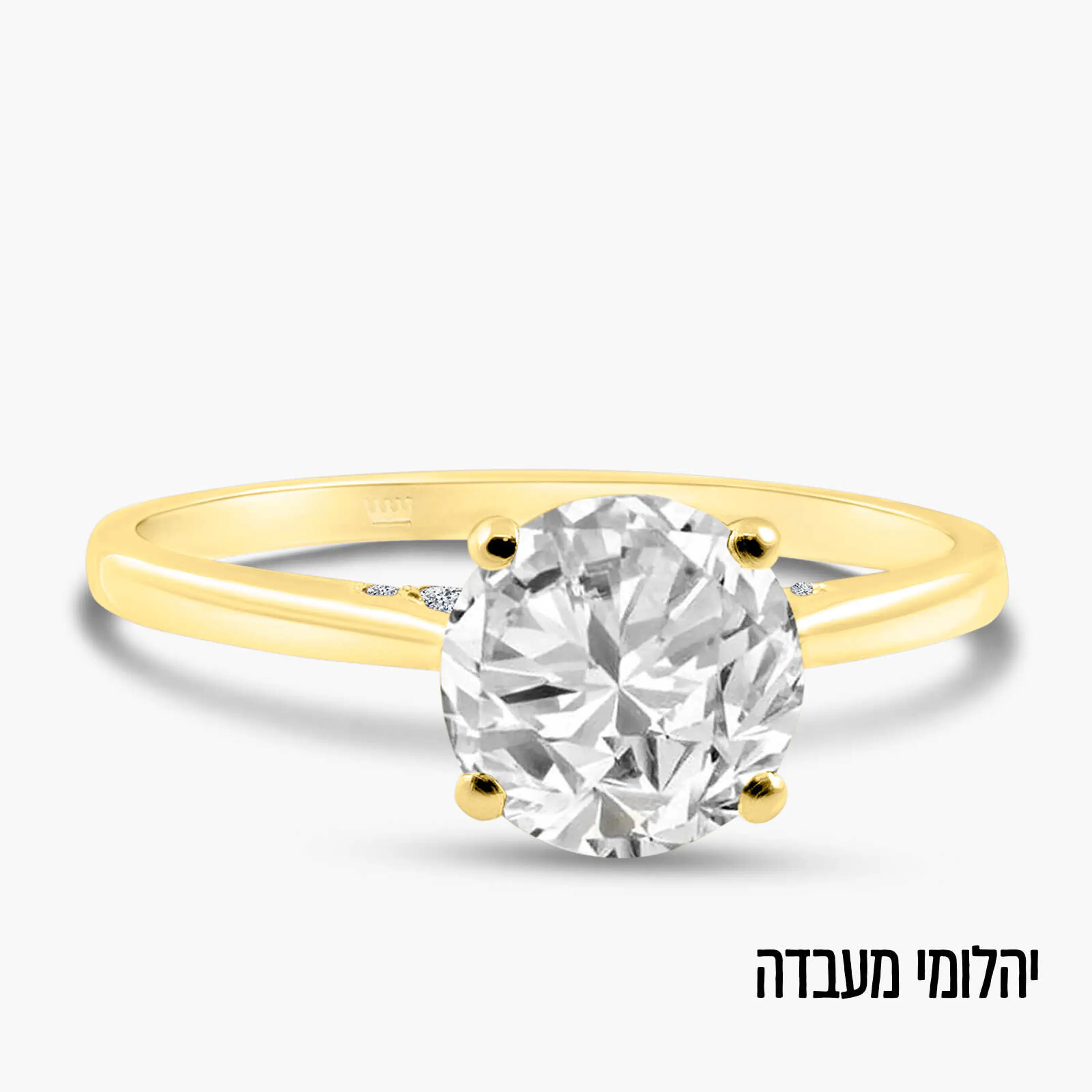 טבעת זהב 14K בעיצוב אלגנטי עם יהלום מעבדה מרכזי וליווי של יהלומי צד עדינים. הטבעת משלבת אבן מרכזית עגולה הנתמכת בשיבוץ קלאסי בעל ארבע שיניים, ומתחתיה קשת של 14 יהלומי מעבדה קטנים, כולל יהלום מרכזי ליצירת אפקט מפתיע ומרשים מכל זווית מבט. עיצוב נקי עם נגיעה מקורית.