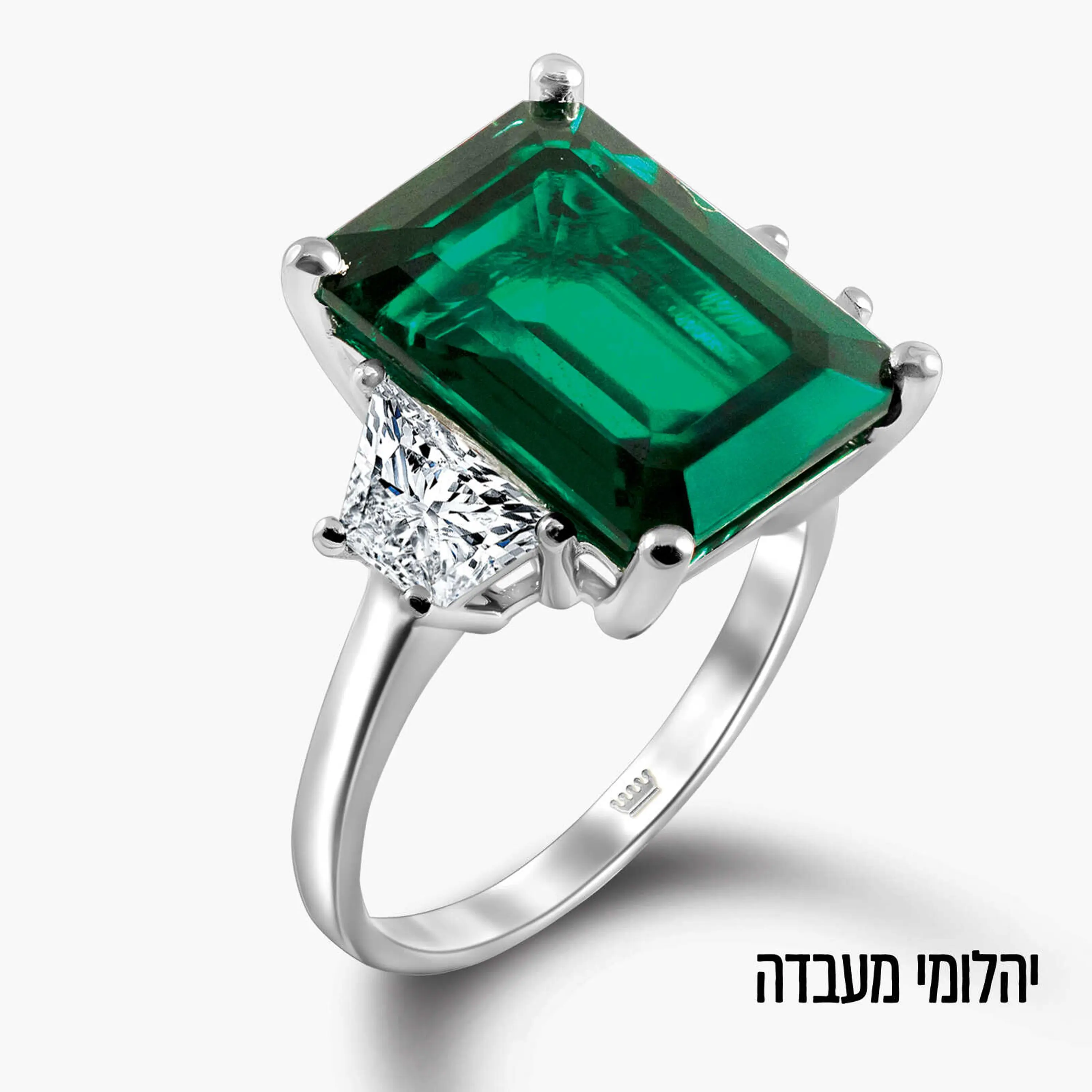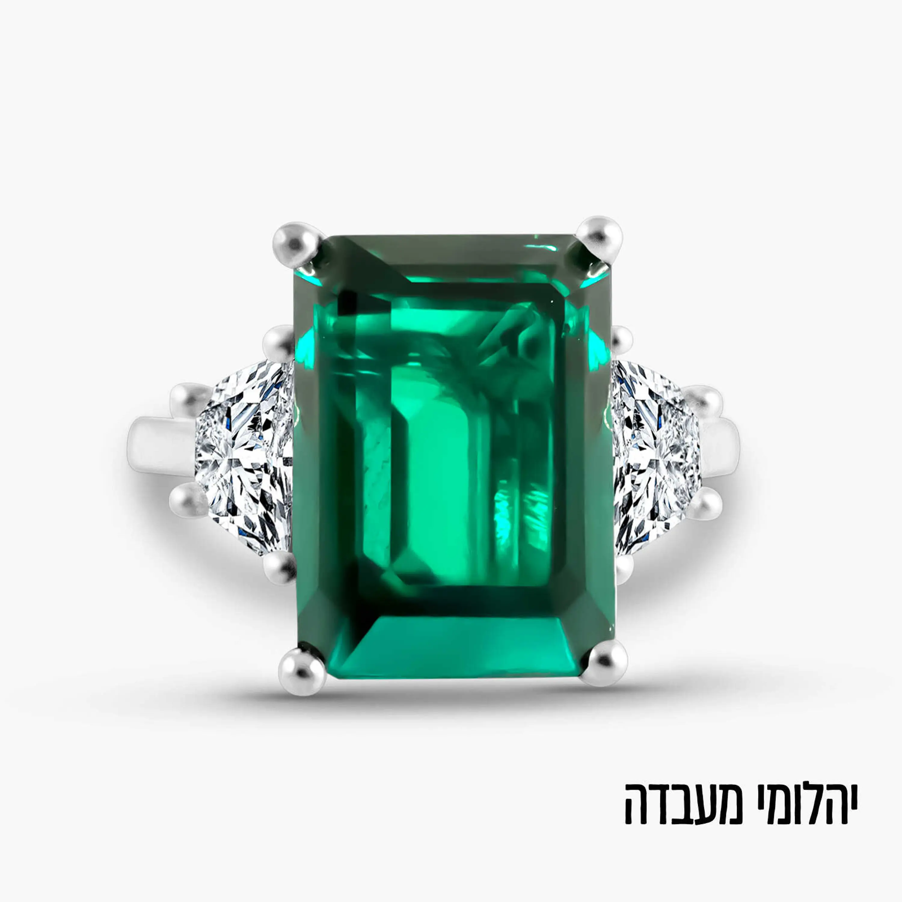 טבעת בעיצוב קלאסי על-זמני, עם אבן מרכזית מסוג אמרלד מעבדה בגוון ירוק עמוק מהפנט, משובצת בין שני יהלומי מעבדה בחיתוך טרפז ליצירת ניגוד זוהר ומדויק.