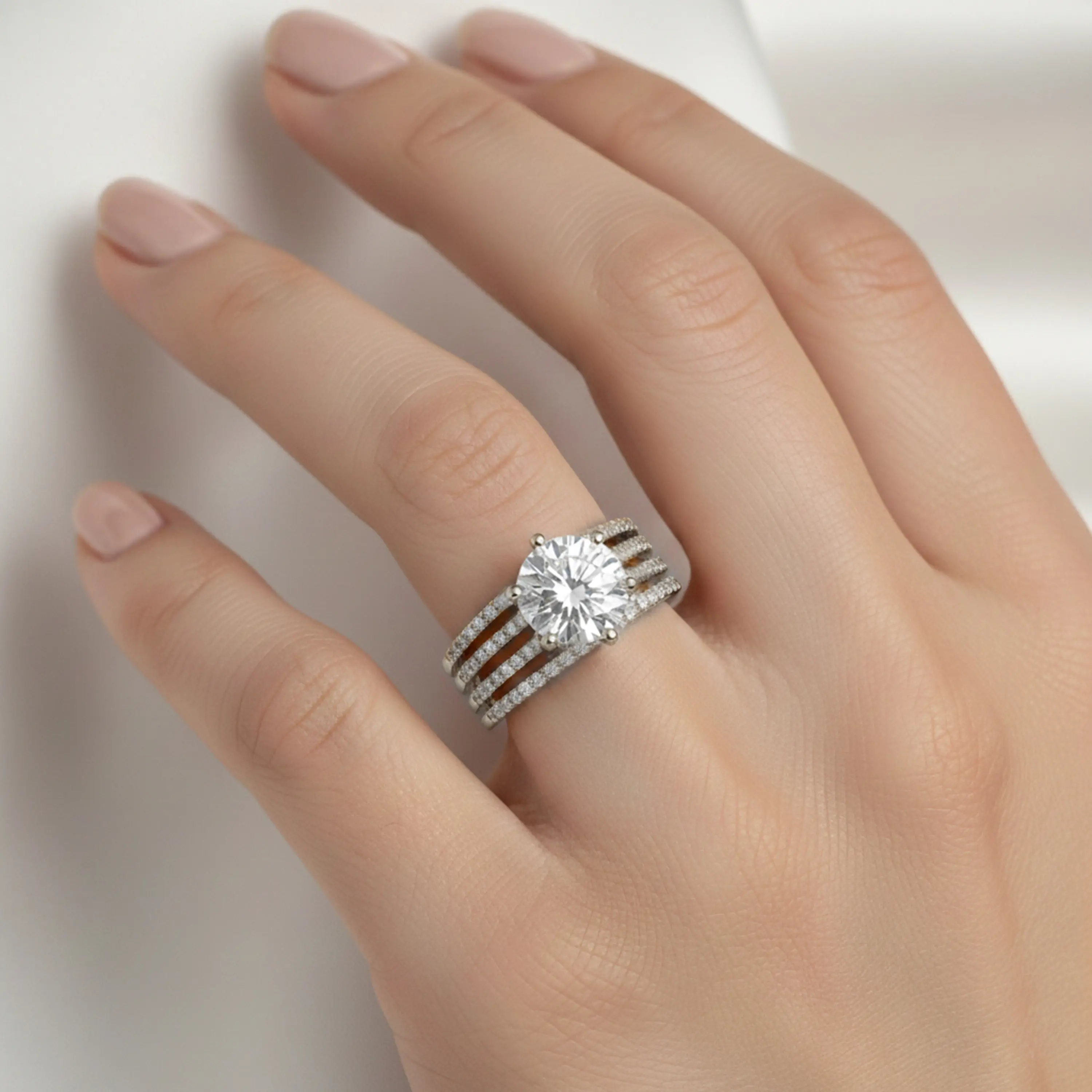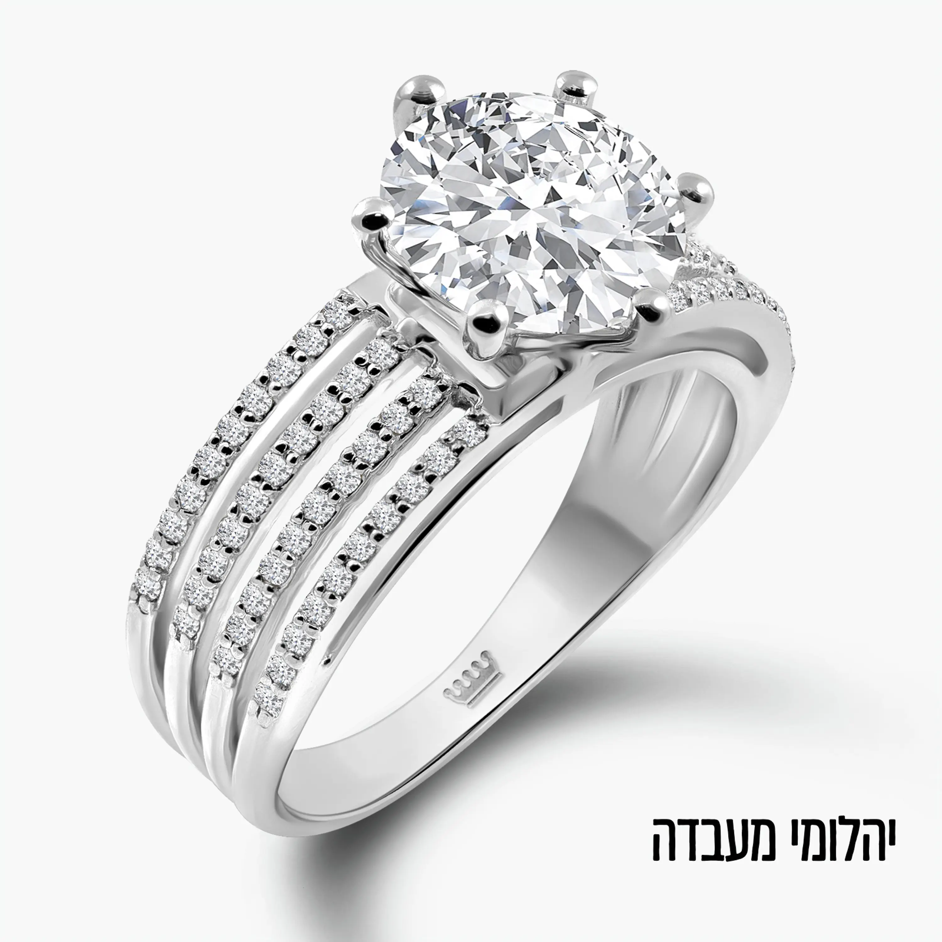 טבעת זהב 14K בשיבוץ יהלומי מעבדה. טבעת נוכחת ומרשימה עם יהלום מעבדה מרכזי עגול, הנתמך בשישה שיניים גבוהות ליצירת מראה יוקרתי ומואר. זרועות הטבעת מעוצבות בשלוש שורות מקבילות המשובצות ב 80 יהלומי מעבדה קטנים ונוצצים, להעצמת תחושת העומק והברק מכל זווית.
