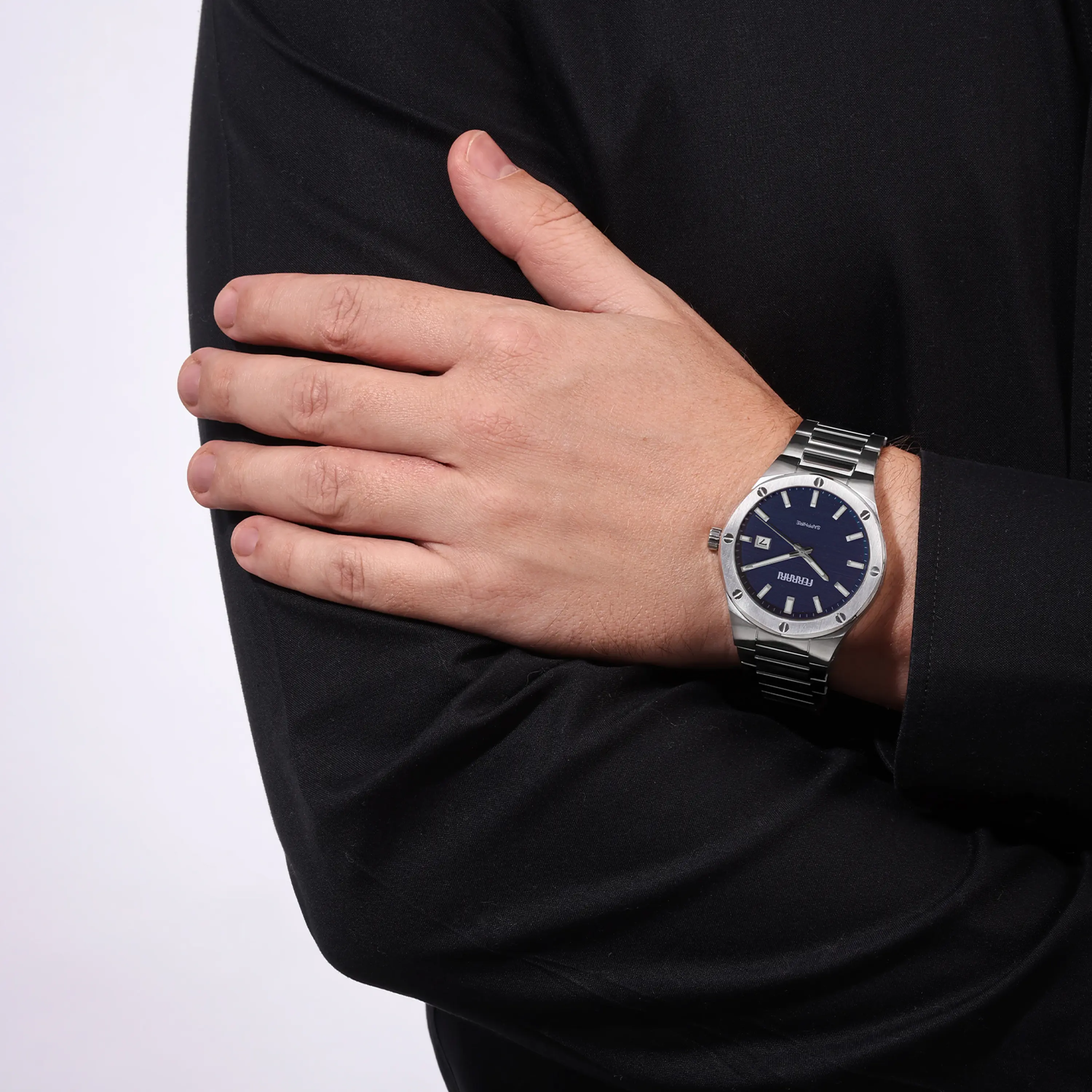 שעון FERRARI לגבר. לוח השעון בגוון כחול כהה ובקטסטורת משיכת מכחול ובצירוף תאריכון. לשעון מנגנון קוורץ וזכוכית ספיר קריסטל למניעת שריטות. גוף השעון והצמיד עשויים פלדת אל חלד איכותית. קוטר השעון 43 מ"מ.