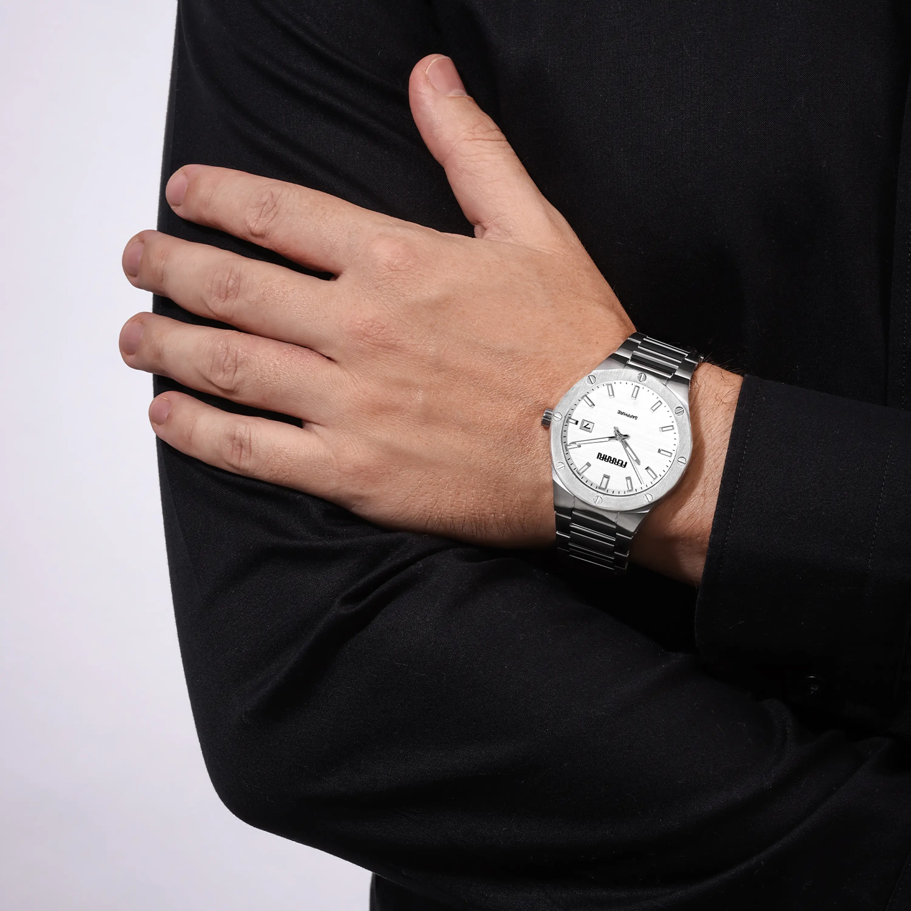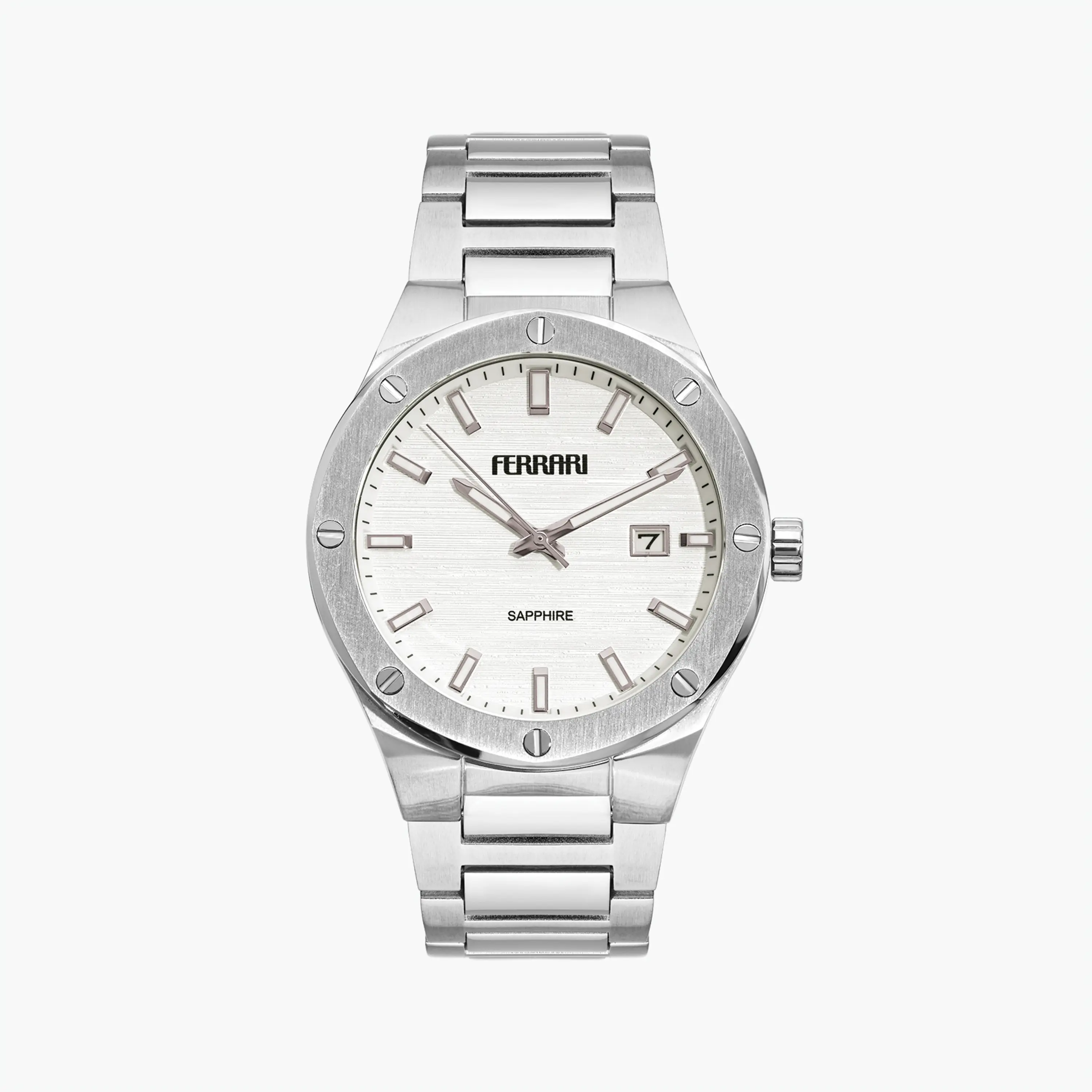 שעון FERRARI לגבר. לוח השעון בגוון כסוף ובקטסטורת משיכת מכחול ובצירוף תאריכון. לשעון מנגנון קוורץ וזכוכית ספיר קריסטל למניעת שריטות. גוף השעון והצמיד עשויים פלדת אל חלד איכותית. קוטר השעון 43 מ"מ.