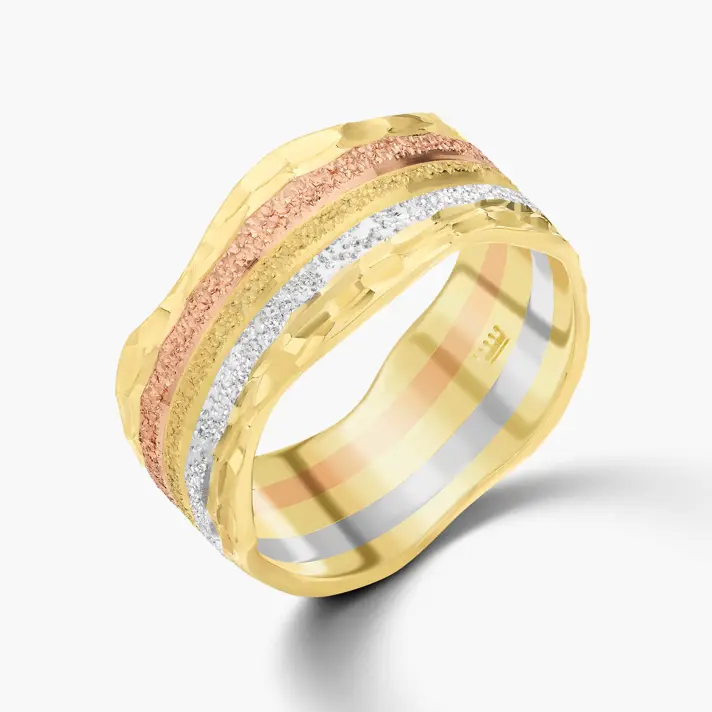 טבעת נישואין בדוגמת פסים, בשני צבעי זהב. ניתן להזמין בכל מידה, צבע ורוחב.