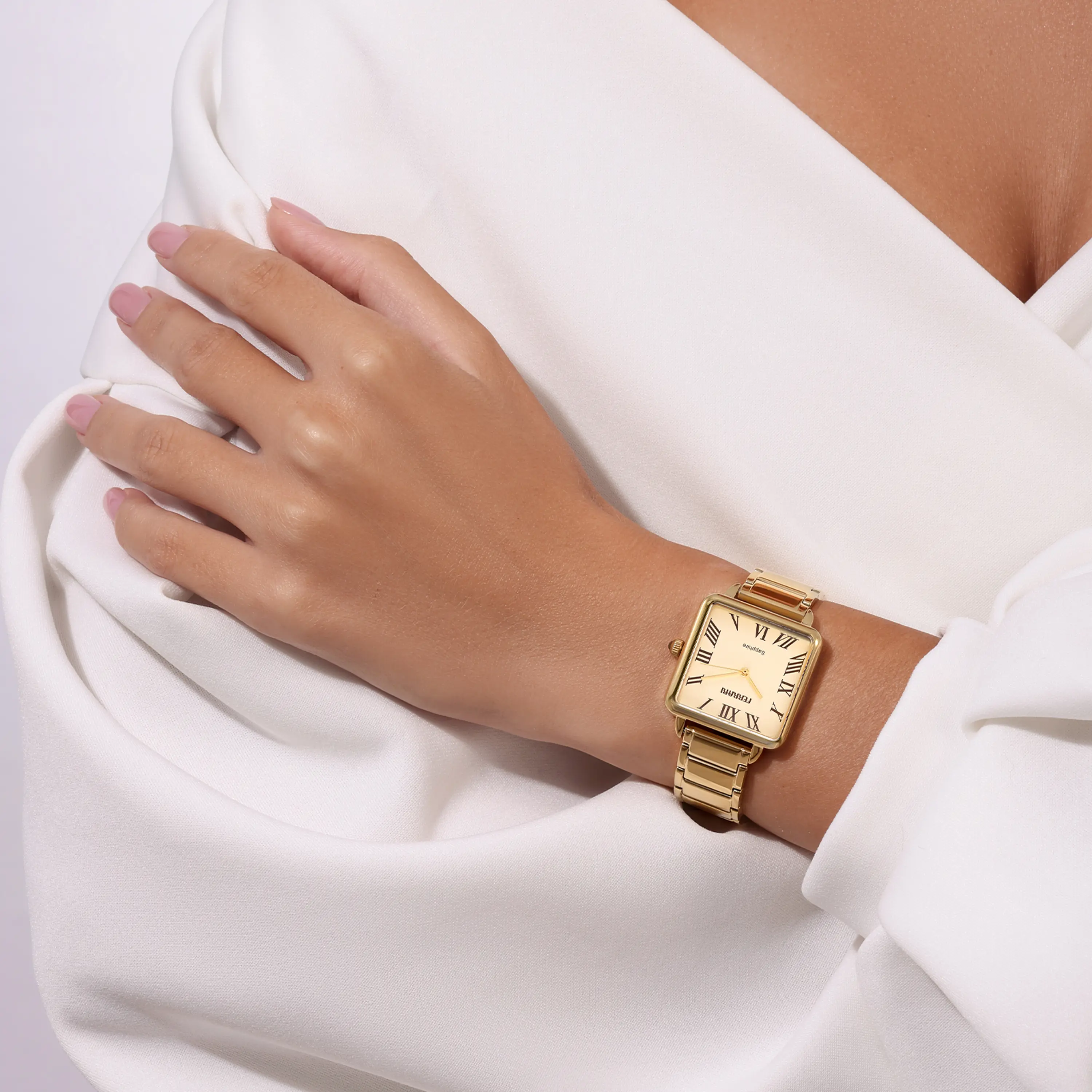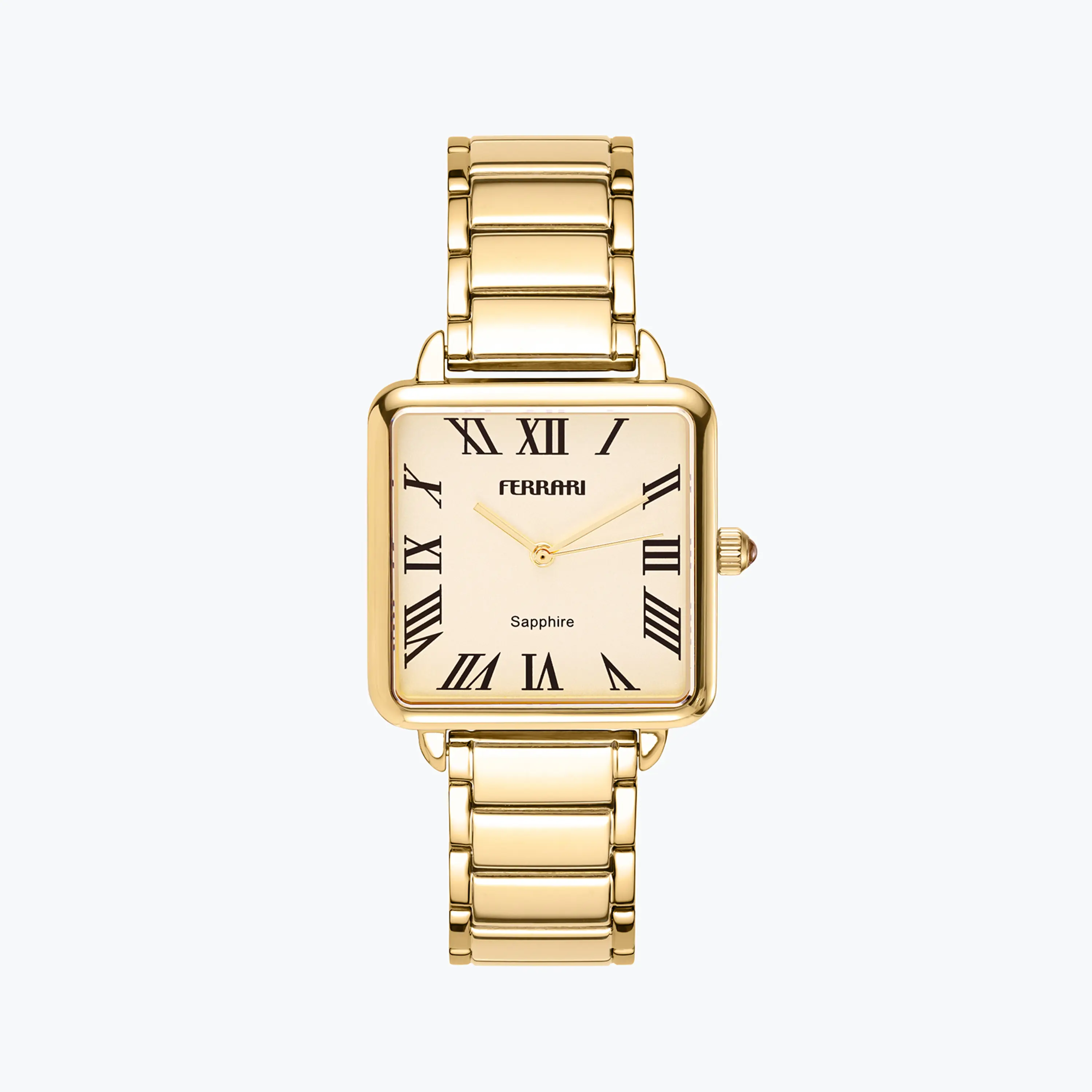 שעון FERRARI נשים מרובע, במראה קלאסי- אלגנטי ועל זמני בגוון שמפניה עם ספרות רומיות. לשעון מנגנון VJ21 קוורץ, זכוכית ספיר קריסטל למניעת שריטות. גוף השעון והצמיד עשויים פלדת אל חלד איכותית בגוון זהוב, כתר השעון משובץ באבן תואמת להשלמת המראה הקלאסי- יוקרתי. השעון עמיד לשטיפת ידיים בלבד.