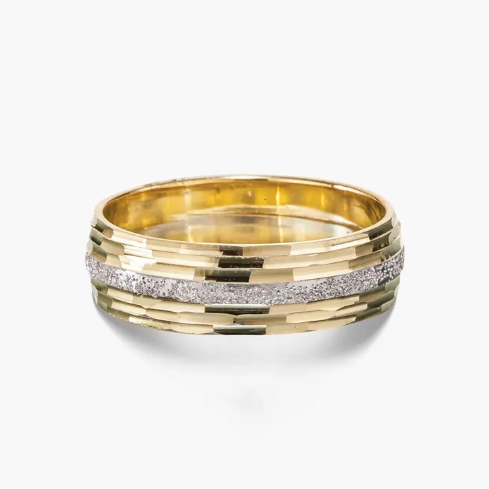 טבעת נישואין בזהב צהוב אשר באמצעה עוברת טבעת זהב לבן.  ניתן להשיג את הטבעת בכל שילוב צבע זהב,גודל ורוחב.